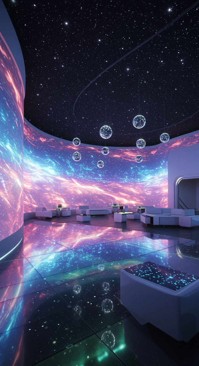 Imagine a futuristic interior space where the boundaries between technology and design blur seamlessly, inspired by the mesmerizing MSG Sphere in Las Vegas. The room features enormous curving digital screens that wrap around the walls and ceiling, projecting vibrant, dynamic visuals that transform the space into an immersive experience. The floor is a sleek blend of polished glass and intelligent material that adapts its appearance based on the digital displays above. Suspended orbs of light, reminiscent of star constellations, float in mid-air, adjusting their intensity and hue in harmony with the ambient visuals. Modular furniture with AI-integrated surfaces offers comfort while intuitively reacting to the occupant's needs, creating a harmonious environment where cutting-edge technology meets innovative design.