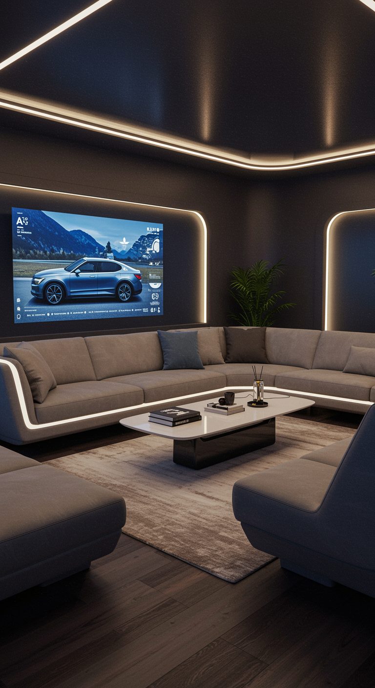 Imagine a futuristic living room seamlessly blending the sleek elegance of a Polestar 2 interior with cutting-edge AI-driven design elements. The space features contoured furnishings inspired by the car's aerodynamic shapes, with upholstery resembling the car's sustainable vegan materials. Ambient lighting shifts hues like a Polestar's dashboard, reacting intelligently to inhabitants' moods. A minimalist coffee table, reflecting the center console's design, floats in the center, surrounded by plush seating that echoes the car's ergonomic seats. Walls mimic the car's digital interface, displaying interactive artwork and adaptive window views that simulate the car's panoramic sunroof experience. This room offers a harmonious balance of advanced technology and serene aesthetics, inviting guests to relax in an environment where AI and automotive luxury converge seamlessly.