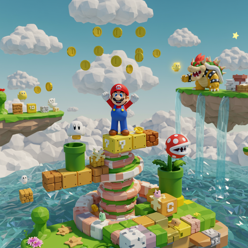 A vibrant, fantastical scene of Mario standing triumphantly atop a swirling, floating platform made of colorful blocks, coins hovering magically around him in a dreamy, cloud-filled sky. Below, cascading waterfalls of pixelated textures flow into a sea of shimmering polygons. Beside Mario, a digital rendition of a piranha plant emerges playfully from a warp pipe, while a low-poly Bowser roars in the distance. All elements merge harmoniously to create a whimsical, immersive 3D world, bursting with nostalgic charm and modern flair.
