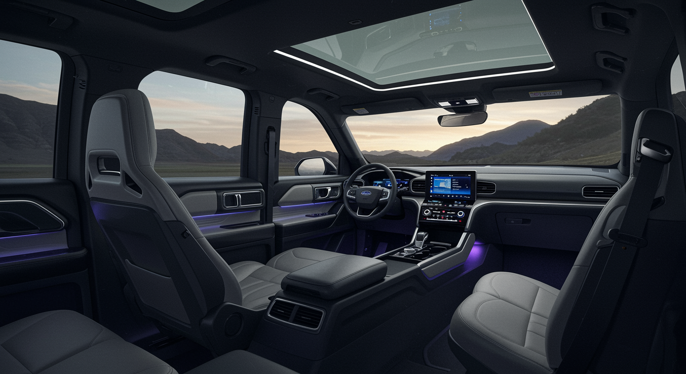 Imagine a futuristic living space that seamlessly integrates the sleek design elements of the 2021 Ford Explorer interior within a home setting. Visualize an open-concept area where the aerodynamic lines and ergonomic seating of a vehicle interior morph into plush lounge chairs and minimalist furniture. The dashboard becomes a smart home control panel embedded in the wall, and the ambient lighting echoes the car's sophisticated ambient glow, creating a tranquil atmosphere. Textured materials like brushed aluminum and soft leather wrap around the room, while a panoramic sunroof concept floods the space with natural light, evoking the spacious and airy feeling of an automobile's interior. This imaginative fusion embodies a luxurious yet functional environment, epitomizing the essence of AI-driven interior design.