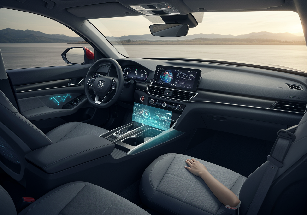 Imagine an AI-designed futuristic lounge seamlessly integrated into the 2022 Honda Accord interior, where the car's sleek dashboard morphs into an interactive digital art gallery, displaying dynamic and colorful graphics. The seats transform into intelligent ergonomic pods that adjust to passenger body shapes, featuring touch-sensitive surfaces and ambient lighting that subtly changes according to mood. In the center, a smart glass coffee table with holographic displays projects user-interface controls for entertainment and climate settings. The AI element is highlighted by voice-activated personal assistants embedded throughout the cabin, responding with visual cues and soft sounds of nature, creating a tranquil yet cutting-edge driving environment.