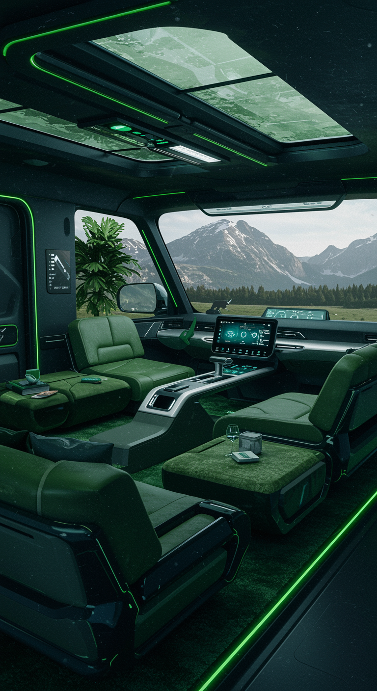 Imagine stepping into a futuristic living space inspired by the interior of the 2022 Kia Telluride, where sleek, aerodynamic lines blend with earthy, natural materials. This AI-designed room features a harmonious palette of deep, metallic blues and lush green accents, echoing the Telluride's adventurous spirit. Instead of traditional furniture, the space is filled with modular, adaptive seating that mimics the Telluride's ergonomic comfort, seamlessly integrating smart technology with ambient light that adjusts throughout the day. A central digital hub symbolizes the vehicle's dashboard, anchoring the room with touch-screen controls for lighting, temperature, and immersive audio experiences. Overhead, a ceiling resembling a panoramic sunroof allows natural light to flood the room, creating an organic connection to the outside world while whispering the promise of untamed exploration.