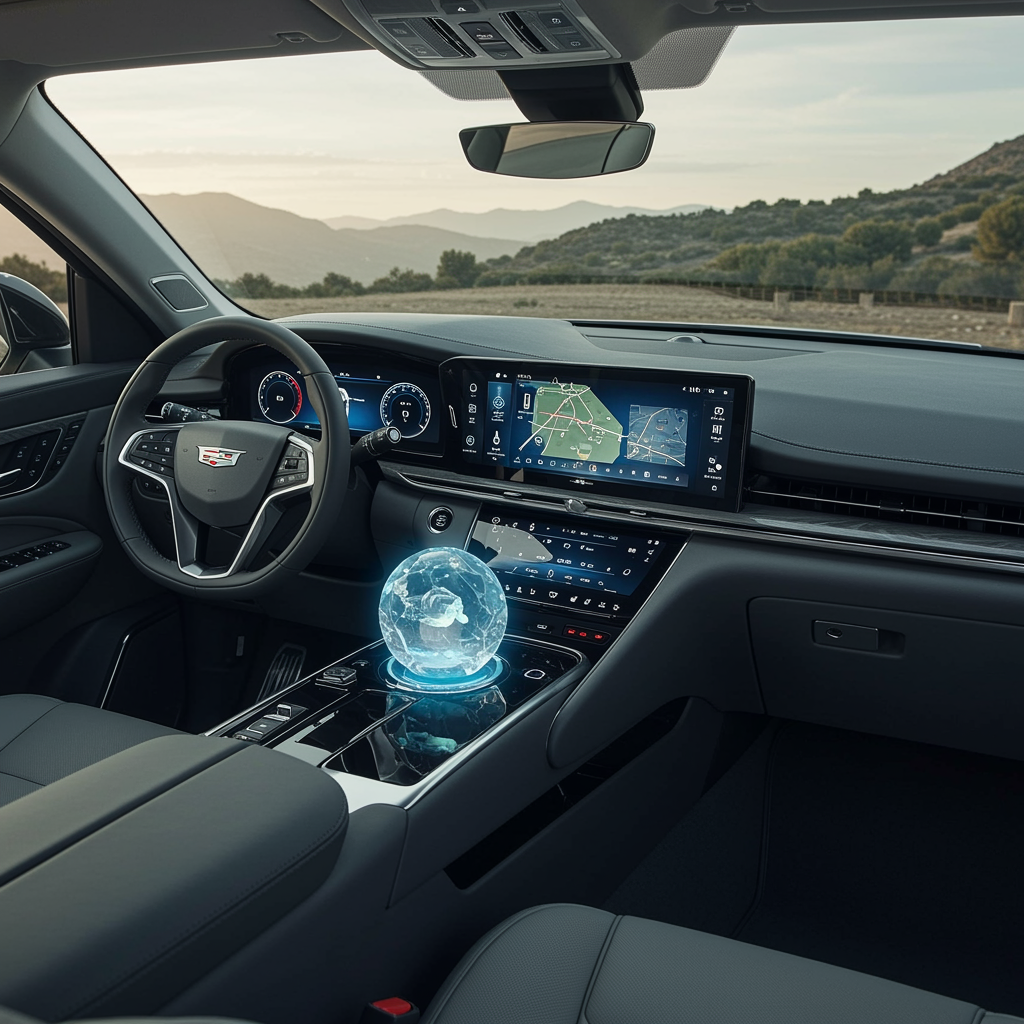 Envision a futuristic 2024 Cadillac Escalade interior where AI seamlessly integrates with luxurious design; imagine an elegant, spacious cabin bathed in soft ambient light, with responsive touchscreens that fluidly adjust to the driver's preferences. The dashboard exudes sophistication, featuring holographic displays that project navigation onto the windshield, while the AI assistant resides within a sculptural crystal orb in the center console, ready to anticipate the passengers' needs. The seats, upholstered in eco-friendly materials, adapt to body contours, and AI-generated art decorates the interior panels, offering an ever-changing gallery of digital masterpieces. The harmonious blend of technology and opulence immerses occupants in a serene yet cutting-edge environment.