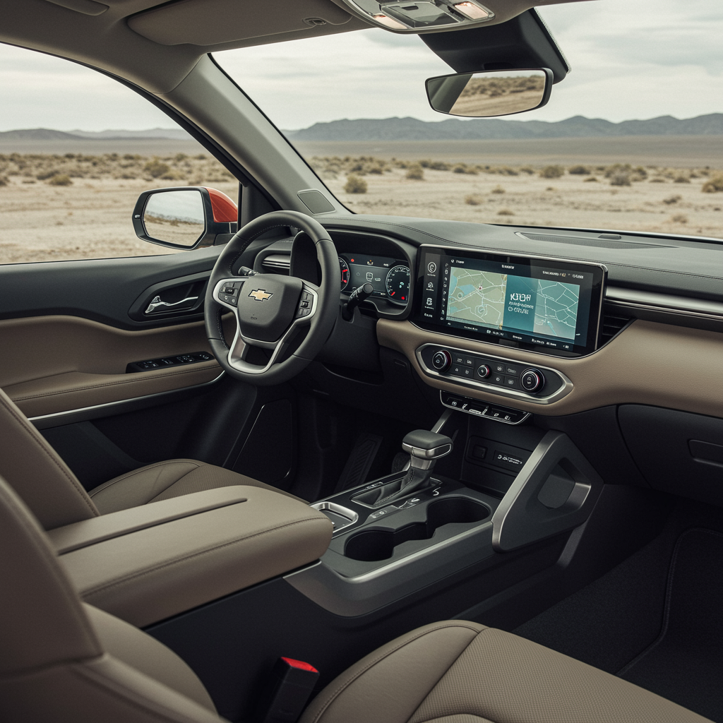Envision a futuristic 2024 Chevy Colorado interior where AI-driven design meets cutting-edge technology: a cocoon of sleek, sustainable materials seamlessly blending with ambient lighting to create a dynamic atmosphere. Infused with intelligent interface panels that morph and adapt to the driver's preferences, the cabin feels like a symbiotic extension of oneself. The dashboard features a holographic display, projecting not just navigational data, but a curated visualization of personal wellness metrics, all designed to enhance the journey. Soft, breathable textiles in earthy tones contrast with metallic accents, while the aroma of digital cedarwood subtly promotes focus and relaxation, enveloping passengers in an eco-tech sanctuary on wheels.