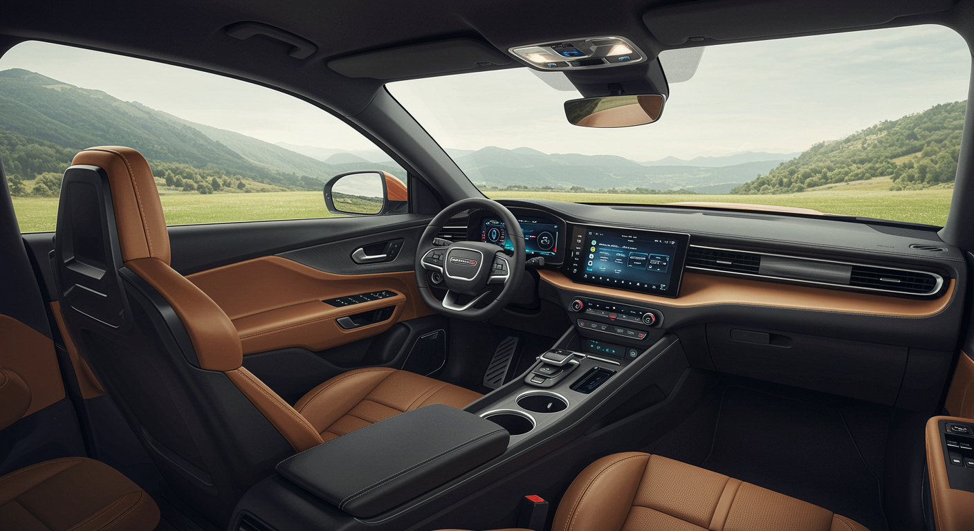 An image of a futuristic AI-designed interior, blending the sleek, athletic essence of the 2024 Dodge Hornet with cutting-edge smart home technology; imagine a seamless fusion of automotive elegance and cozy home ambiance where the dashboard transforms into a multifunctional smart hub, featuring elegant organic curves and eco-friendly materials, ambient lighting dynamically adjusting to the mood, plush seating resembling sophisticated car interiors reimagined as luxurious furniture pieces, all set against a backdrop of expansive digital windows presenting panoramic nature views, creating a harmonious balance between high-tech innovation and serene comfort.