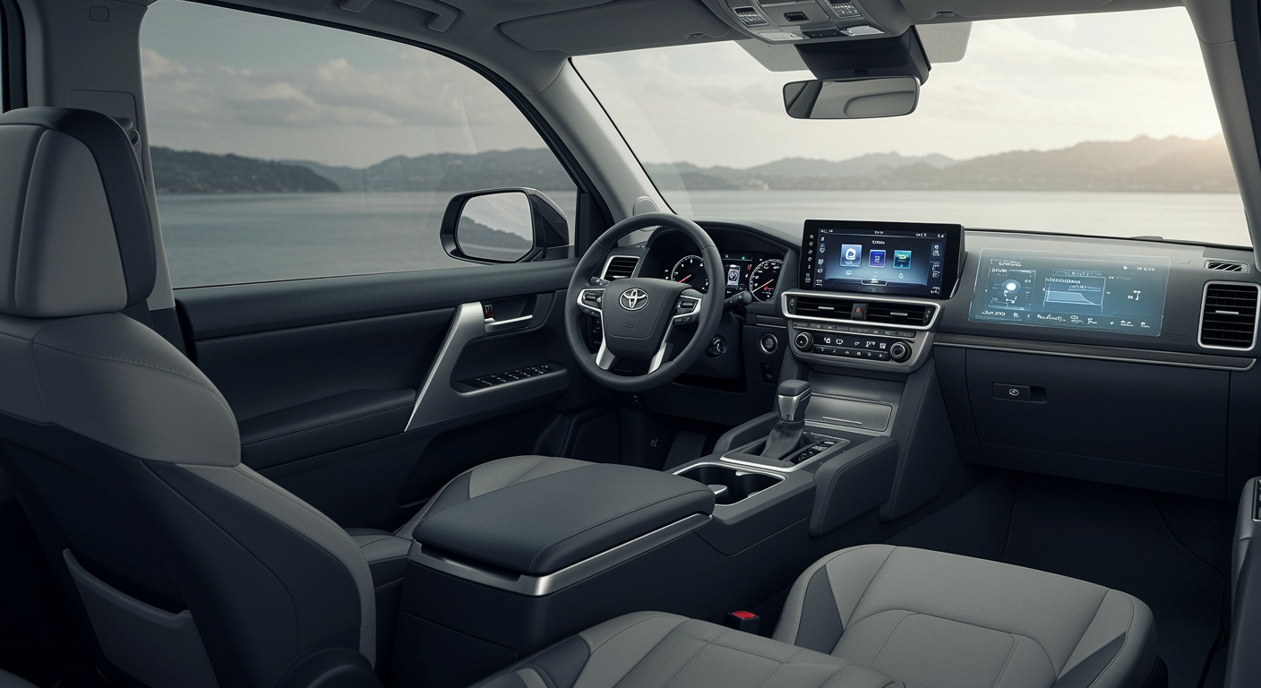 Imagine stepping into the futuristic 2024 Toyota Land Cruiser interior where cutting-edge AI seamlessly blends with luxury and functionality. The cabin is a harmonious symphony of sleek, high-tech interfaces and plush, ergonomically designed seats that adjust intuitively to your posture. Ambient lighting shifts gently in response to your mood, while a holographic dashboard displays vital information and entertainment options with simplicity and clarity. The doors feature smart material that adjusts texture for optimal grip and comfort, enhancing the tactile experience. Soft, sustainable materials with nanotechnology self-cleaning properties adorn every surface, embodying both rugged durability and elegant sophistication. This environment is not just a vehicle's interior; it's a personalized sanctuary, anticipating your needs and ensuring an unparalleled driving journey.