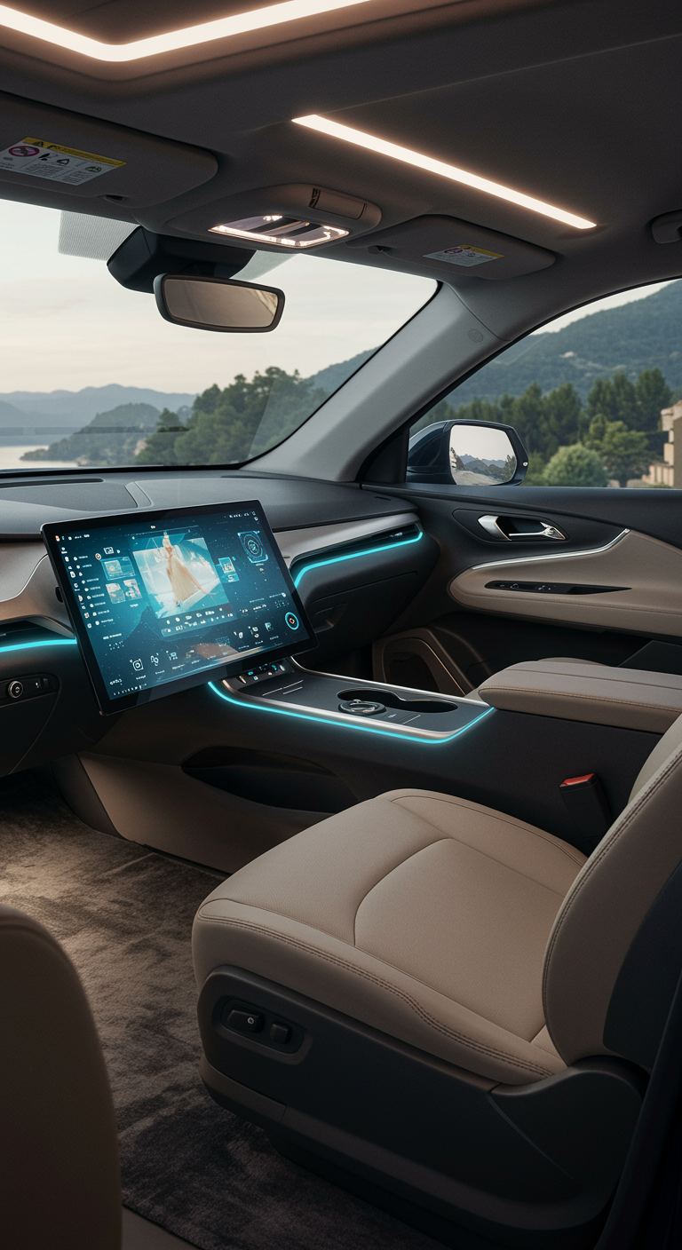 Imagine an ultramodern living space seamlessly blending cutting-edge artificial intelligence technology with the sleek, avant-garde design of a 2025 Chevy Equinox interior. The setting is a futuristic lounge where AI-generated ambient lighting adjusts according to the guests' moods, and furniture crafted from smart materials mimics the vehicle's ergonomic seats, offering ultimate comfort. Interactive digital surfaces echo the Equinox's state-of-the-art dashboard, featuring holographic displays that project customizable art and real-time information. The color palette mimics the car’s luxurious tones, harmonizing metallic hues with soft, ambient glows, creating an environment that epitomizes innovation and elegance in AI-powered interior design.
