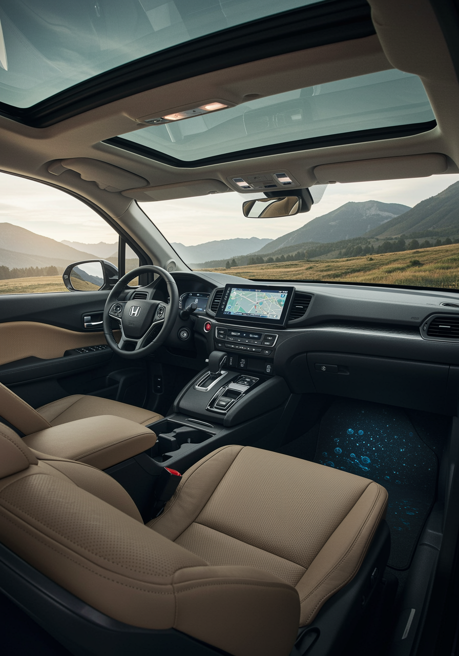 Envision an AI-optimized interior of the 2025 Honda Pilot, where sleek minimalism meets futuristic innovation. The cabin is a harmonious blend of earth-toned organic materials and cutting-edge technology; imagine tactile leather seats infused with smart cooling technology. The dashboard displays a holographic control panel seamlessly integrating AI-driven navigation and infotainment. Soft ambient lighting shifts colors based on mood, while vast sunroof panels simulate varied weather patterns. Picture AI-guided ergonomic seating adjustments, ensuring ultimate comfort on every journey. The serene environment harmonizes nature and technology, a leap into the future of automotive interiors.