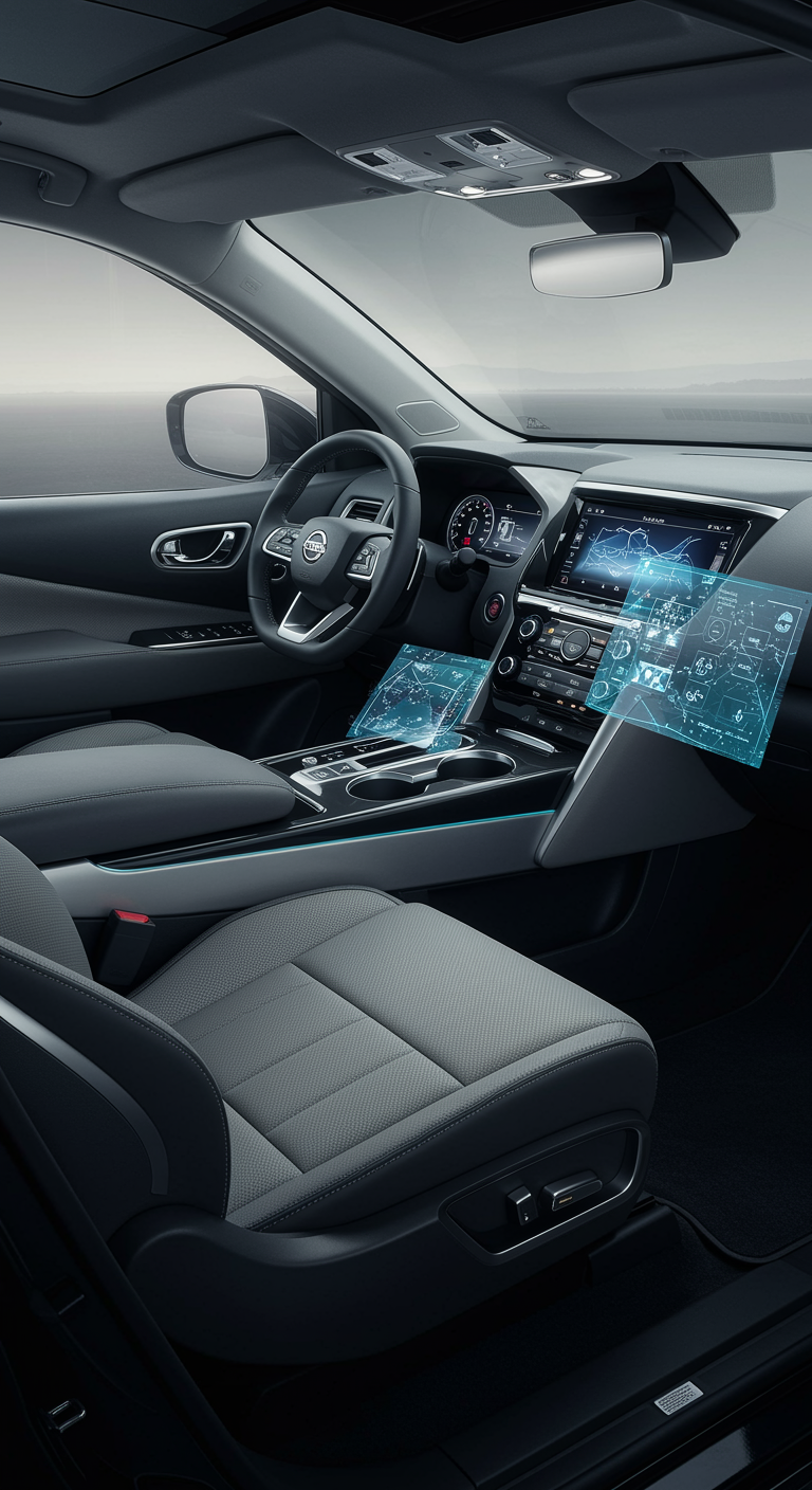 Imagine stepping into a futuristic 7-seater Nissan Pathfinder, where AI has seamlessly integrated modern luxury with advanced technology. The interior is a symphony of sleek surfaces and ambient lighting, with intuitive interfaces and customizable digital displays embedded into the smooth dashboard. The seats are crafted from smart materials that adapt to the body contours of each passenger, providing unparalleled comfort. Elegant lines and textures mimic the organic flow of nature, while holographic projections deliver personalized driving information and entertainment, transforming the cabin into a cutting-edge sanctuary of innovation and style. Represent the epitome of intelligent design, where function meets futuristic flair.