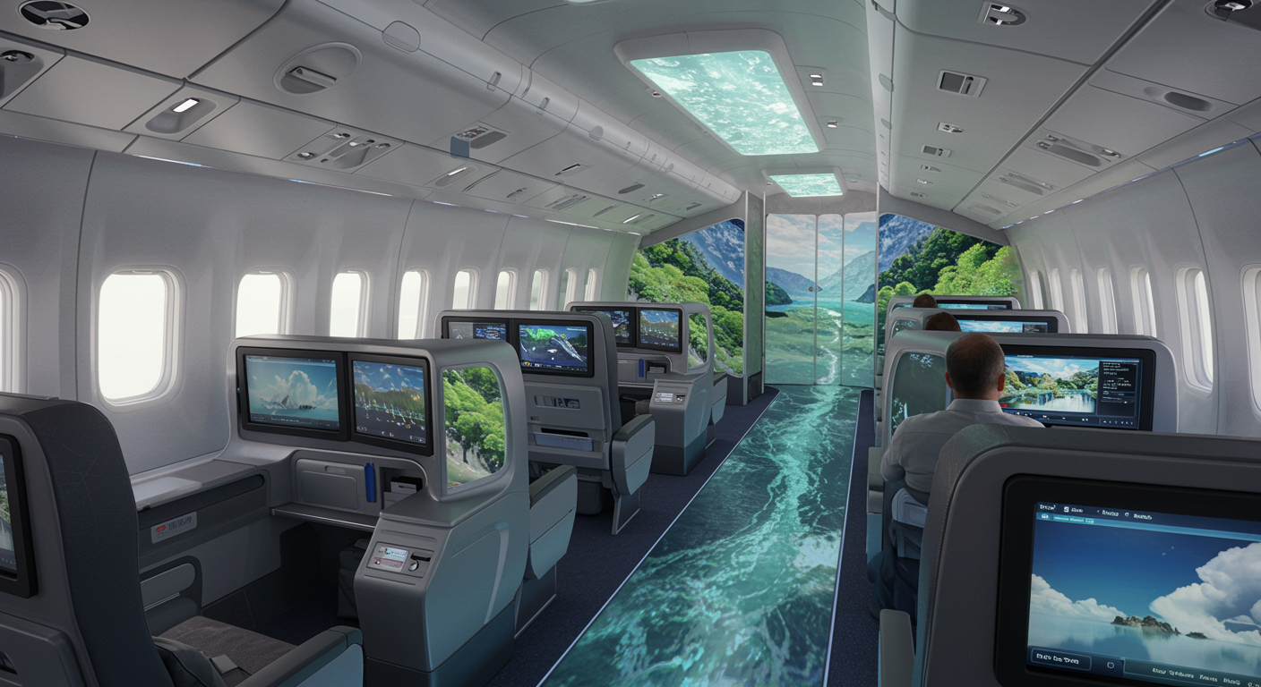 Imagine a futuristic Airbus A380 interior, reimagined with AI-driven design: the cabin is bathed in soothing ambient lighting that dynamically shifts based on passenger moods, intuitive smart seats morphing for personalized comfort, overhead storage seamlessly integrating holographic displays showcasing passenger info and entertainment, walls adorned with programmable nature-inspired digital art creating an illusion of infinite space, a central aisle with an AI-guided soft kinetic floor mimicking a tranquil river, while whisper-quiet drones efficiently serve refreshments from a cloud-connected smart bar.