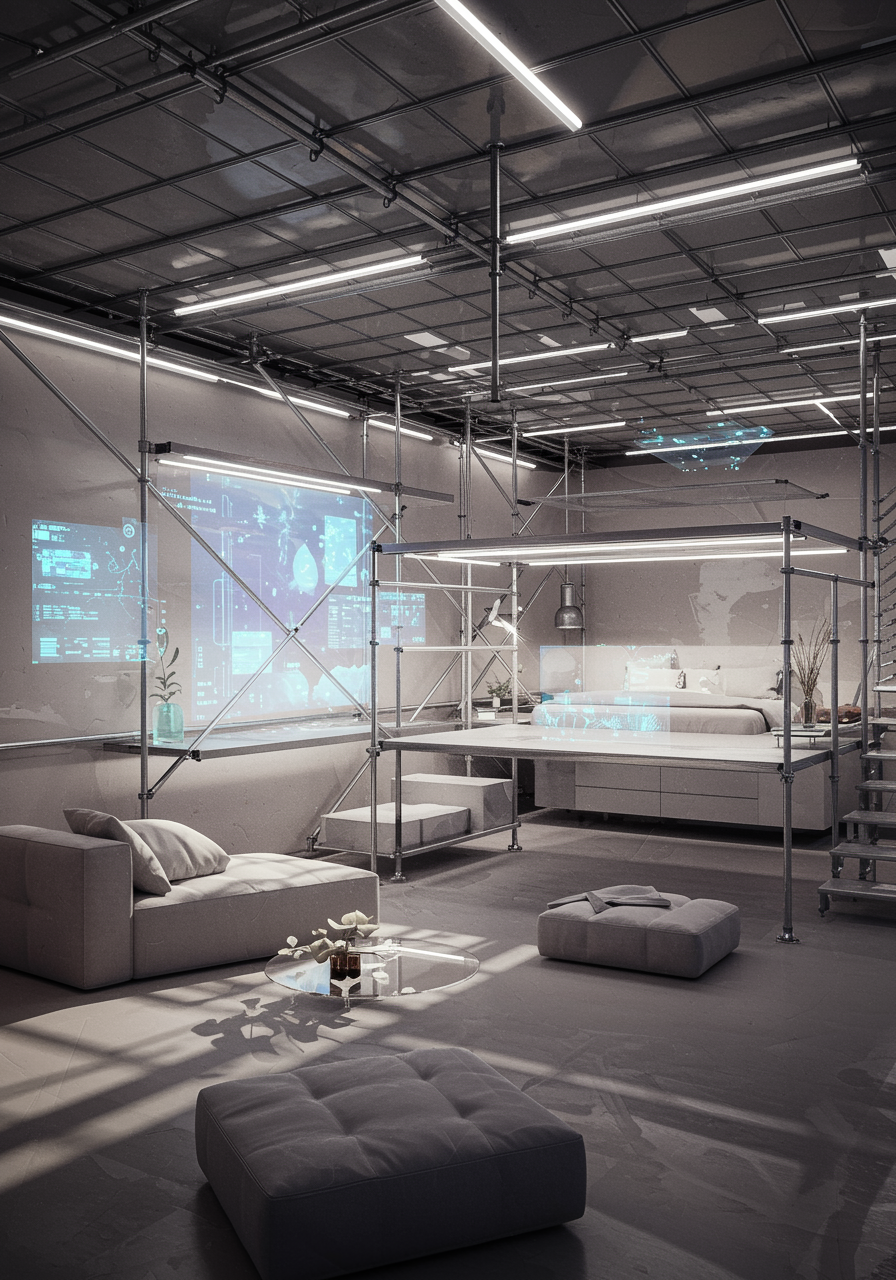 Imagine a futuristic living space where walls and ceilings seem to float, supported by a network of sleek, metallic frames resembling an interior hung scaffold. The room's design showcases the seamless integration of AI-driven enhancements, with holographic walls that change to suit your mood and furniture that adjusts its shape and comfort level in response to sensors embedded throughout the space. Ambient lighting emanates from suspended platforms within the scaffold, casting intricate shadows that dance across the ultra-modern decor. A central AI hub, made from transparent materials, autonomously monitors and manages the living environment, ensuring an ideal balance of comfort and efficiency. This interior masterpiece represents a harmonious blend of cutting-edge technology and sophisticated design, epitomizing the next generation of smart living.