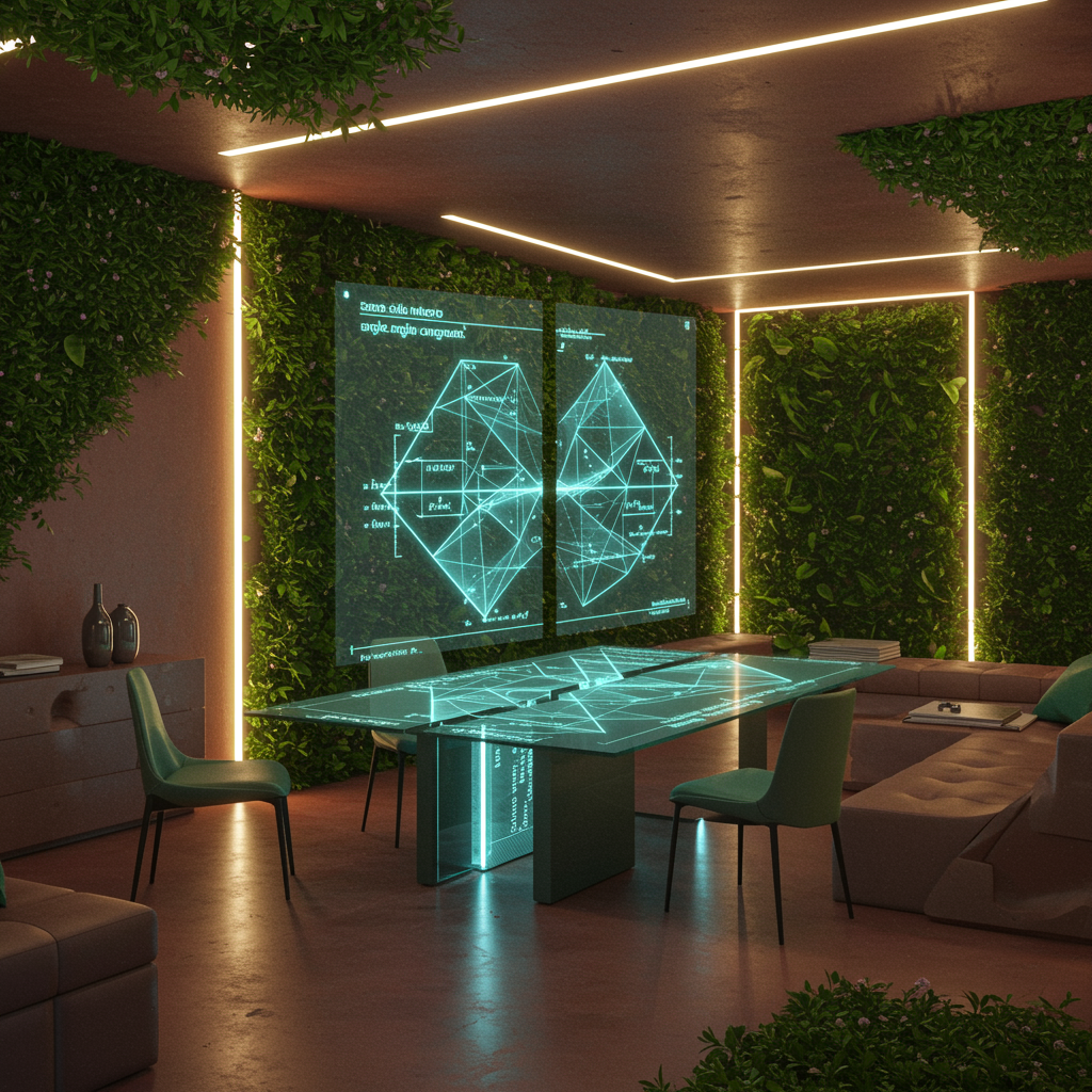 In a futuristic living room designed by AI, lush greenery intertwines with sleek metallic surfaces, where a holographic floor plan vividly displays the concept of "same side interior angles congruent" morphing into an abstract geometric art form. The room's furniture is seamlessly integrated into the design, featuring chairs that mimic angular congruence and a table that appears to split and mirror itself across invisible lines. The walls are adorned with dynamic LED strips that pulse in sync with the concept, creating a mesmerizing symphony of symmetry and balance, while intelligent ambient lighting bathes the room in a serene, harmonious glow.