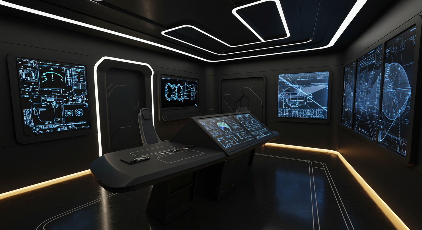 Envision an ultra-modern interior space where sleek, futuristic design elements blend seamlessly with the advanced technology of the B2 Bomber's cockpit, creating a harmonious environment. The room features smooth, flowing lines and high-tech materials, reflecting the aerodynamic efficiency and stealthy aesthetics of the aircraft. Soft, ambient lighting highlights the matte black surfaces and high-resolution digital displays integrated into the walls, evoking a sense of both luxury and cutting-edge innovation. A control console, inspired by the bomber's sophisticated instrumentation, doubles as an interactive design hub, allowing for customization and adaptability of the space in real-time. The overall atmosphere is one of quiet power and modern elegance, perfectly embodying the essence of AI-driven interior design.