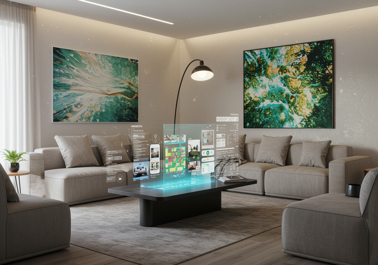 Imagine a futuristic living room bathed in soft ambient lighting, where sleek, minimalist furniture blends effortlessly with nature-inspired textures. The walls shimmer with dynamic digital art that shifts with the time of day, while a holographic coffee table displays an array of real-time interior design options from the best apps, showcasing layouts, color palettes, and virtual furniture rearrangements at a touch. The environment feels both organic and high-tech, illustrating the seamless integration of AI-driven interior design tools that tailor the space to the inhabitant’s moods and preferences. Everywhere you look, there is a sense of fluid transformation, as if the room itself is alive and continuously evolving.