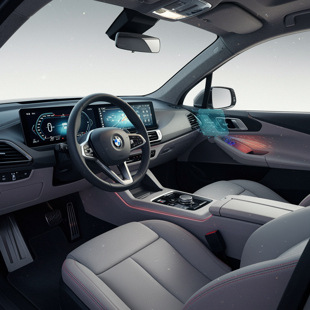 Imagine a futuristic AI-designed interior echoing the sleek elegance of a BMW iX; picture a harmonious blend of cutting-edge technology and luxury, where intelligent ambient lighting adapts to your mood, ergonomically contoured seats exude a sophisticated warmth through sustainable materials, and touch-sensitive surfaces seamlessly integrate with holographic displays, providing an intuitive yet deeply immersive driving experience amidst a sanctuary of serene, flowing lines and subtly pulsating colors that narrate the allure of tomorrow.