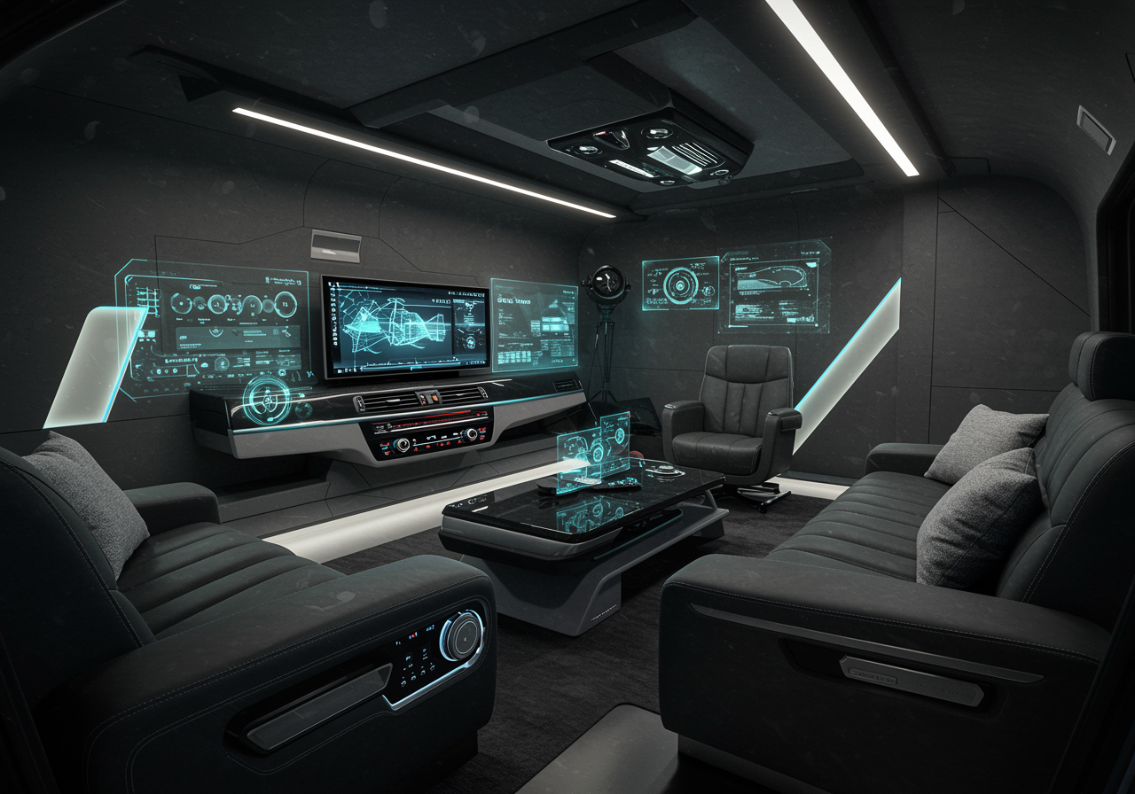 A futuristic living room seamlessly blends the sleek elegance of a BMW M5 interior with cutting-edge AI technology; the space features plush leather seating that echoes the car's luxury upholstery, a dashboard-inspired entertainment center with holographic displays, ambient lighting that changes color to match the mood of the occupants, and advanced AI interfaces embedded into the walls, offering personalized settings and controls; the room embodies a harmonious fusion of automotive sophistication and intelligent design, inviting you into a world where speed meets serenity and innovation shapes comfort.
