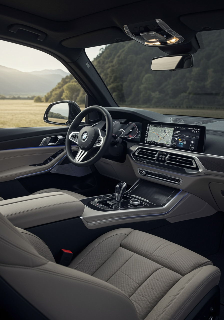 Envision a futuristic living space inspired by the luxurious interior of the 2024 BMW X5, where sleek metallic finishes blend seamlessly with soft leather textures, ambient LED lighting casts a gentle glow across streamlined digital interfaces, and high-tech elements intertwine with minimalist design to create a harmonious environment that mirrors the elegance and innovation of a next-generation SUV cabin.