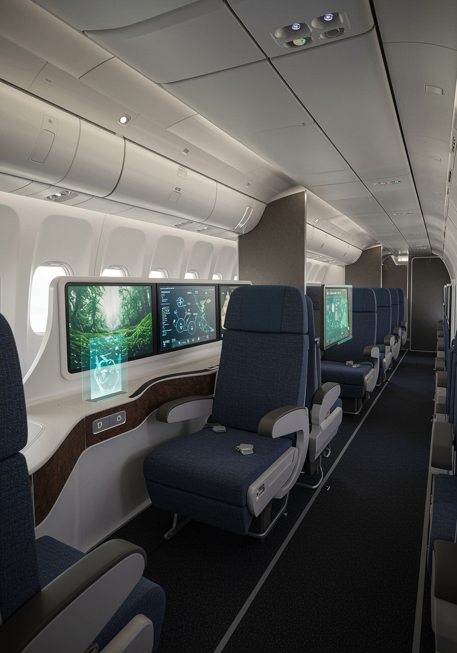 A futuristic Boeing 737 MAX 8 interior seamlessly combines cutting-edge AI-driven design with unparalleled luxury, featuring adaptive lighting that mimics natural cycles, self-cleaning upholstery made from smart fabric that dynamically changes color and texture based on passenger preferences, holographic interactive displays integrated into the minimalist aesthetic for an immersive travel experience, and a flowing architectural design inspired by organic forms in nature, conveying a sense of both tranquility and innovation as passengers are surrounded by an ambiance of lush virtual forests gently swaying to simulate a serene, endless flight.