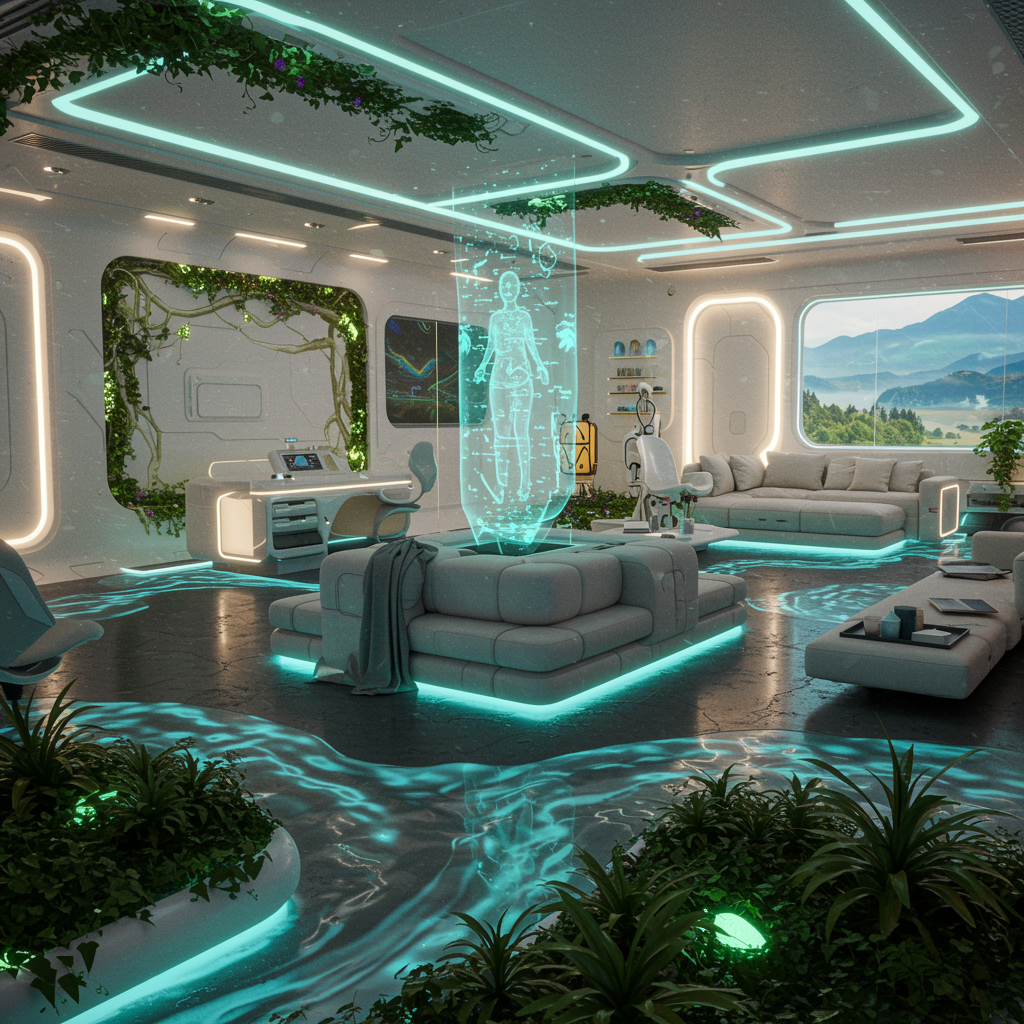 Imagine a futuristic living space seamlessly blending cutting-edge technology with organic elements, featuring a central AI-powered holographic art piece that adapts to the occupant's mood. The room, labeled 'C8 Interior,' showcases sleek, modular furniture with bioluminescent accents, walls that change color based on ambient light, and intelligent glass windows displaying serene landscapes. The floor is an interactive display of flowing patterns mimicking natural streams, while plant life is interspersed throughout, maintained by robotic caretakers. The harmony between nature and innovation creates an elegant, comfortable, and ever-evolving environment.