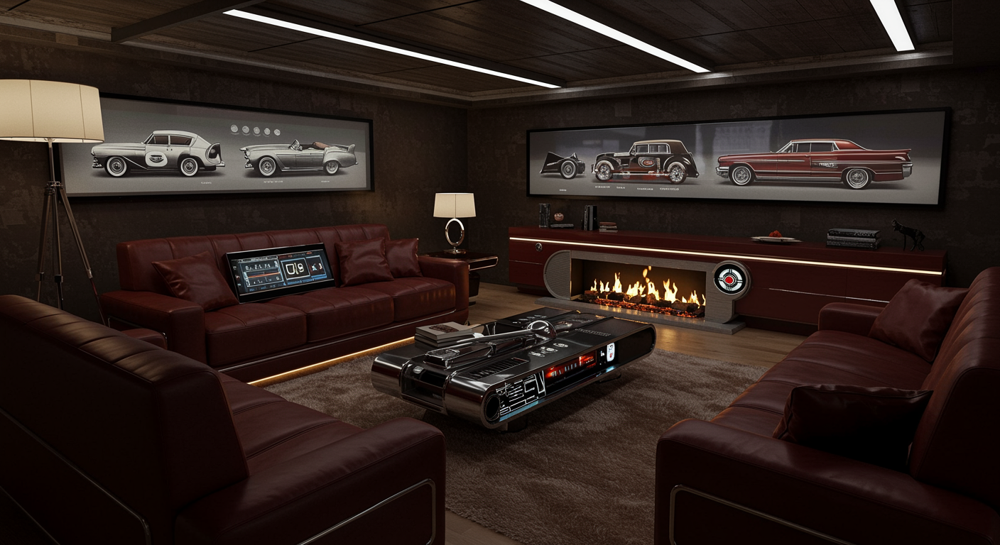 Envision a luxurious AI-designed living room that embodies the opulence and elegance of a classic Cadillac interior, where plush leather seating in deep burgundy hues is juxtaposed with sleek chrome accents. The space is illuminated by ambient, softly-hued lighting reminiscent of dashboard instrument panels, while the flooring mirrors the sheen of a polished hood. A digital display fireplace with a gentle hum of virtual engine soundscapes, retrofuturistic wall art depicting the evolution of automotive design, and a coffee table shaped like a vintage steering wheel complete this high-tech homage to a timeless automotive legacy.