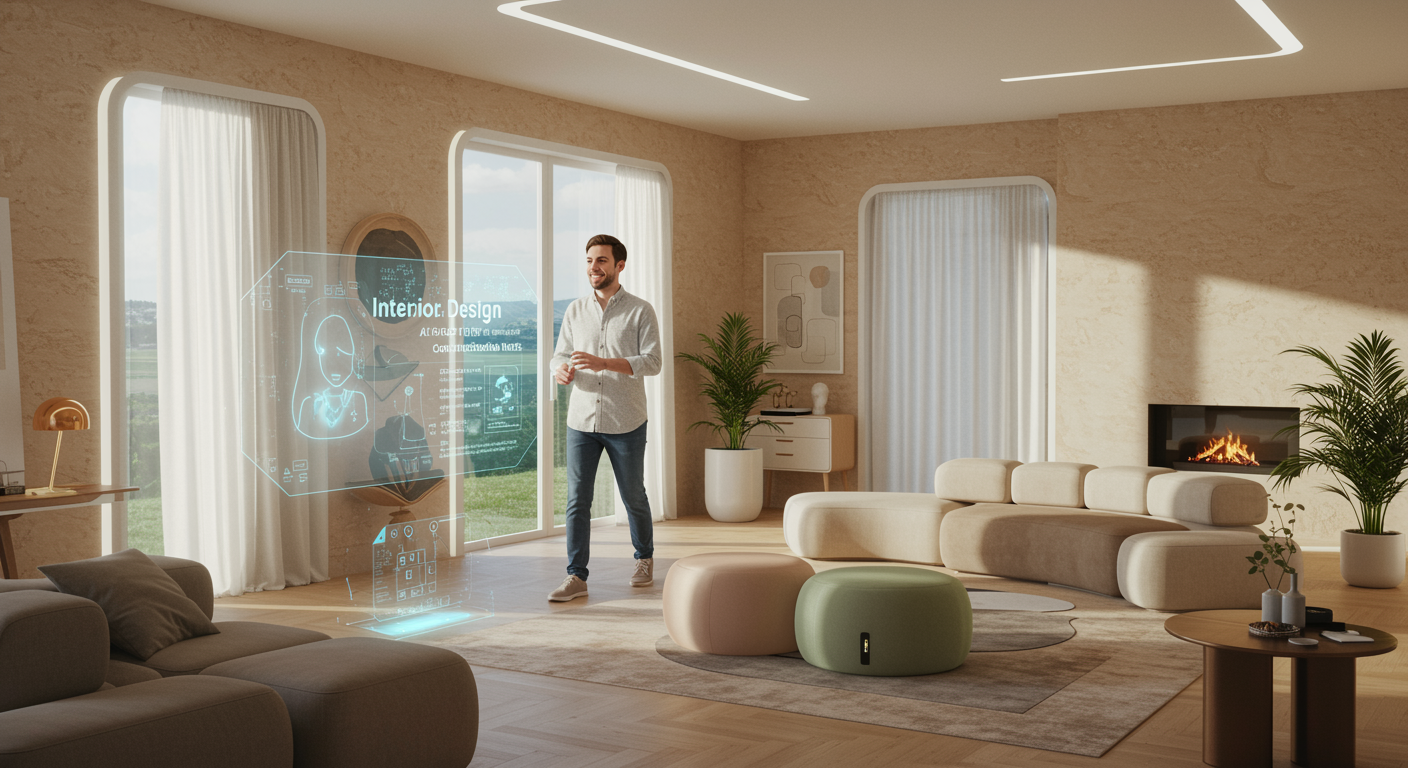 In a sunlit room, an AI-designed interior seamlessly blends futuristic technology with timeless elegance. A sleek holographic interface projects a digital assistant, guiding a beaming homeowner through an interactive interior design certification course. Surrounding this innovative setup, advanced materials mimic natural textures, creating a harmonious space where organic forms meet technological precision. Ambient lighting subtly adjusts colors, enhancing the mood and function of each area, while modular furniture rearranges itself intelligently. This visionary environment not only epitomizes cutting-edge AI interior design but also celebrates the journey of mastering the craft through interactive digital learning.
