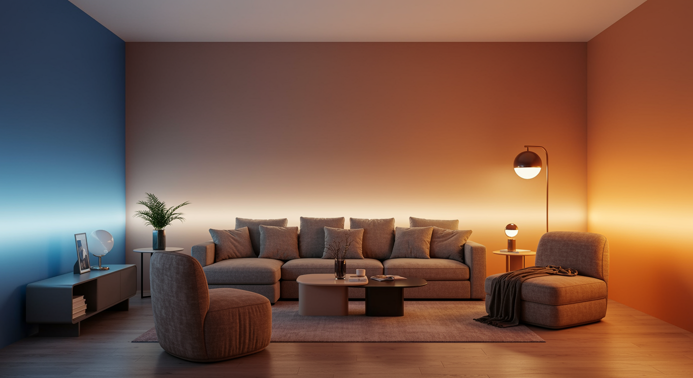 Imagine a futuristic interior living space where AI has carefully curated a harmonious color palette titled "Colores de Pintura para Casa Interior." This room seamlessly blends technology and art with walls showcasing gradient hues transitioning smoothly from serene ocean blues to warm sunset oranges. Each color reflects the time of day, dynamically shifting as natural light changes. The furniture is a symphony of shapes and textures, all selected by AI to complement and enhance the atmosphere. Soft fabrics in muted earth tones contrast with sleek metallic accents, creating a balance between comfort and sophistication. Intelligent lighting interacts with the colors, casting an ever-evolving array of shadows and highlights, transforming the space into a living canvas. The overall ambiance is one of tranquility and innovation, embodying the perfect synergy between AI and interior design.