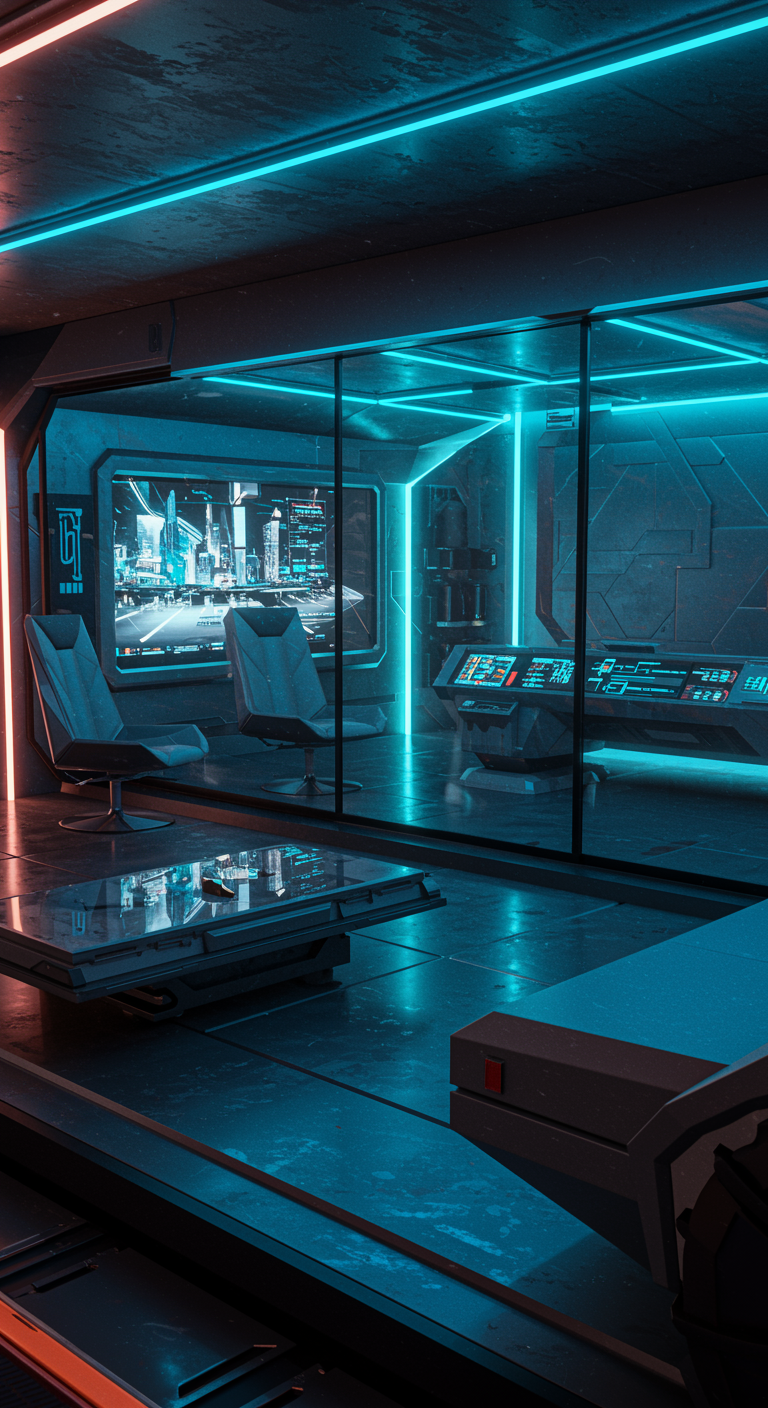 Envision a futuristic living space inspired by the sleek and geometric aesthetics of a Cybertruck, seamlessly merging technology with home design. The interior features angular metallic surfaces and expansive glass panels reflecting soft LED lighting in hues of neon blue and electric silver. Furniture pieces mimic the vehicle's rugged appeal with a minimalist, industrial edge, including chairs with sharp lines and a table that resembles a repurposed dashboard. A wall-sized touchscreen displays a panoramic view of a digital cityscape, blending the concept of a mobile tech sanctuary with luxury and style. The ambiance is a harmonious fusion of automotive innovation and cutting-edge interior design, where every element feels as if it were crafted by an advanced AI, guided by the essence of the iconic Cybertruck's interior.