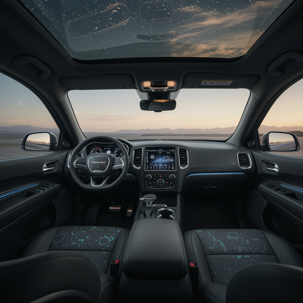 Imagine a futuristic Dodge Durango interior transformed by AI into a seamless blend of cutting-edge technology and elegant aesthetics. The dashboard features a holographic display with intuitive controls, seamlessly integrated around a central console made of sustainable materials that glow faintly with soft ambient lighting. The seats, upholstered in smart fabric, adapt to each passenger's optimal comfort level while projecting changing visual patterns inspired by their preferences. The panoramic roof displays an AI-generated dynamic sky, reflecting the digital interface's palette of colors that shift throughout the journey, creating an immersive driving experience like no other.