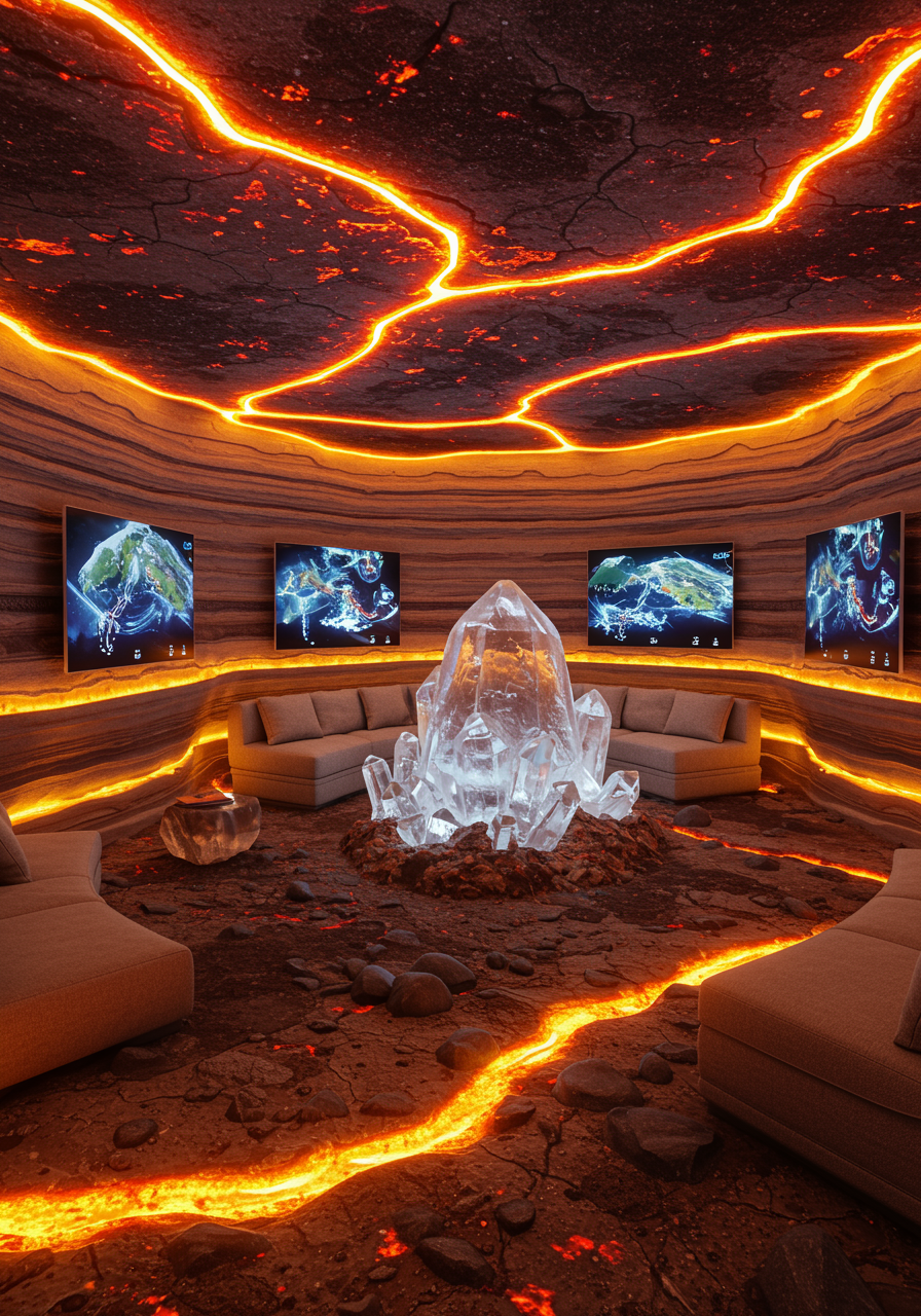 Imagine a futuristic living space inspired by the layers of the Earth's interior, where the ceiling mimics the undulating patterns of tectonic plates adorned with soft, ambient lighting resembling molten magma. The walls are crafted from layered translucent materials, simulating sedimentary rock, and embedded with smart panels displaying dynamic visuals of geothermal energy flows. The floor resembles a cross-section of rich mineral deposits, with plush textured sections mimicking the feel of raw earth and smooth, cool surfaces like polished basalt. A central seating area, shaped like a crystalline geode, offers interactive features controlled by AI, allowing residents to adjust the environment's temperature and mood lighting, ensuring harmony between human life and nature's elements.