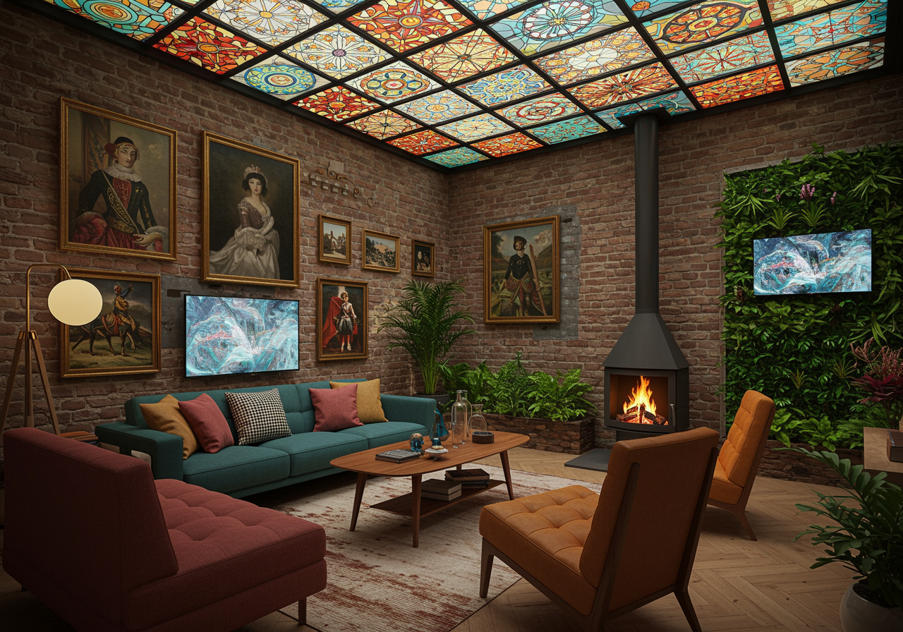 Imagine stepping into a vibrant living room where artificial intelligence breathes life into an eclectic tapestry of styles; a cozy space featuring a bohemian glass ceiling with a kaleidoscope of stained glass patterns casting colorful reflections on mid-century modern furnishings, juxtaposed against an industrial-chic exposed brick wall adorned with a collection of vintage paintings and digital art screens displaying mesmerizing ethereal animations; a lush, indoor vertical garden nourished by smart sensors fills the air with freshness, while a sleek AI-enhanced fireplace mirrors the flickering dance of ancient and futuristic flames, creating a harmonious blend of the old and new in an effortless symphony of design.