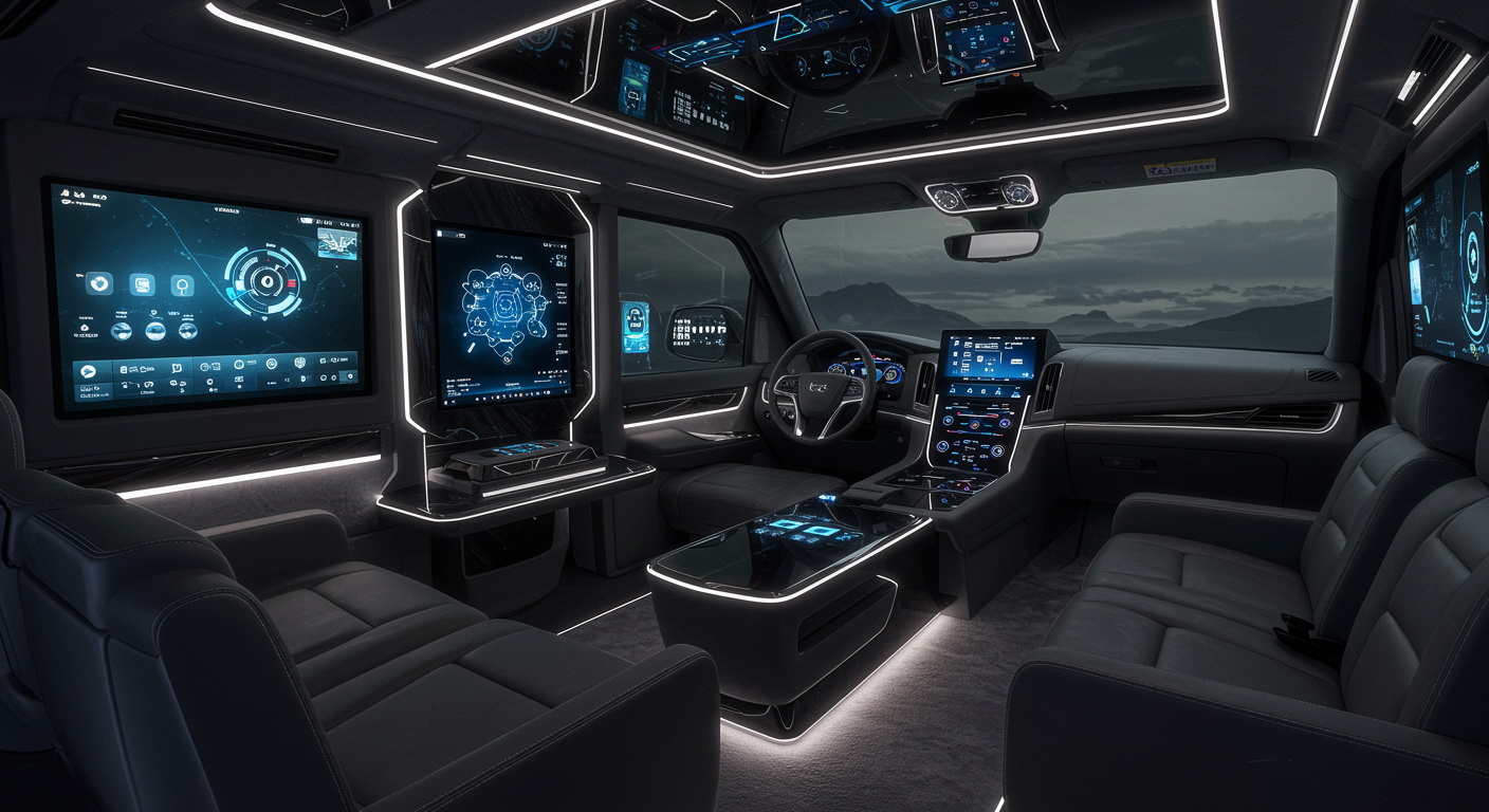 Create a futuristic living space inspired by the luxurious interior of an Escalade V, featuring sleek leather seating that seamlessly blends into the room's overall design. The walls are adorned with advanced digital panels displaying customizable ambient lighting and interactive interfaces, while a high-tech dashboard control center functions as the room's hub. Elegant metallic accents and a panoramic smart glass ceiling evoke a sense of automotive sophistication. The flooring mimics the vehicle's plush carpeting, and strategically placed sound systems provide an immersive audio experience, transforming this interior into an AI-driven haven of comfort and style.