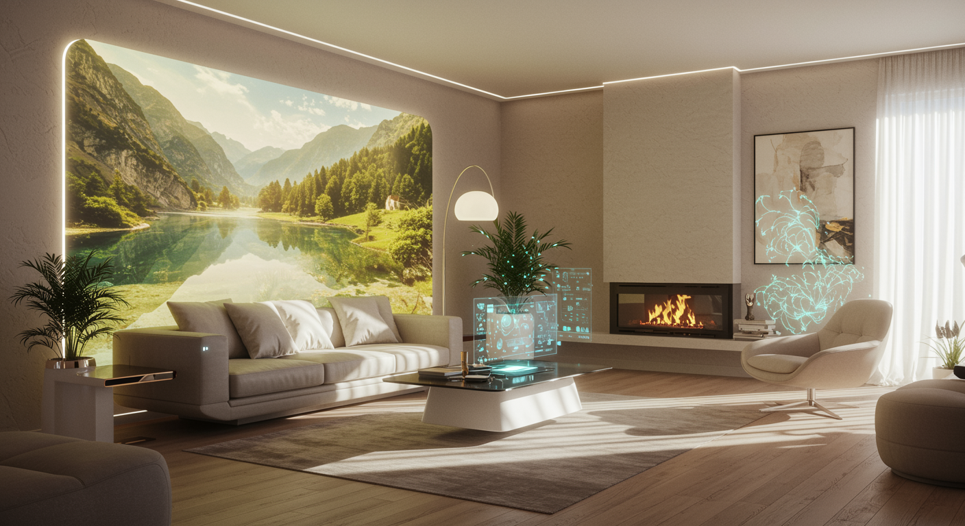 In a futuristic living room, sleek AI-integrated furniture adjusts its form based on the occupant's preferences, reflected in a glistening glass window displaying digital art of serene landscapes. The room's color palette shifts with the time of day, enhancing mood and energy, while dynamic light sculptures suspended from the ceiling gently sway, casting mesmerizing patterns on the walls. A central coffee table made from sustainable materials features a holographic interface where interactive design elements float, ready to be customized. Soft sounds of nature blend with an ambient AI-generated melody, creating a harmonious atmosphere within this technologically-advanced yet inviting interior sanctuary.