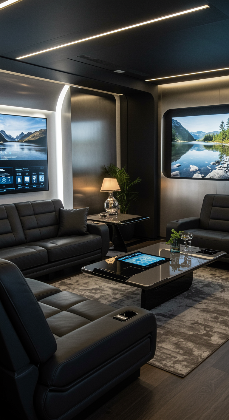 Imagine stepping into a futuristic living space where the sleek contours and modern aesthetics of a Ford Edge interior inspire the design. The room features elegant, automotive-inspired seating with rich, plush leather upholstery in deep charcoal, illuminated by ambient lighting that echoes the subtle yet dynamic glow of dashboard interfaces. The walls are adorned with a blend of metallic accents and digital panels displaying serene landscapes, emulating the panoramic view from a car’s windows. In the center, a coffee table that resembles a car's console with integrated smart technology for seamless connectivity, surrounded by an arrangement that feels both luxurious and high-tech. This space embodies the harmony of comfort and innovation, where every element is inspired by the seamless, ergonomic design of a sophisticated vehicle interior.