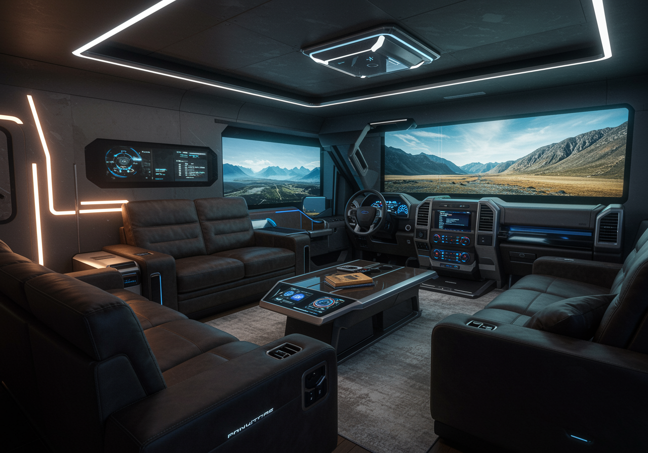 Imagine a futuristic living room seamlessly blending AI technology with the rugged elegance of a Ford F150 interior. The space features plush, leather seating inspired by truck upholstery, with dashboard-style control panels integrated into the coffee table. Sleek LED lighting traces the room like ambient automotive lights, casting a soft glow onto metallic textures reminiscent of a vehicle’s trim. A panoramic digital screen spans one wall, displaying changing landscapes as if viewed through a windshield, while smart home features adjust the environment to mimic the comforting ambiance of riding in a high-tech pickup.