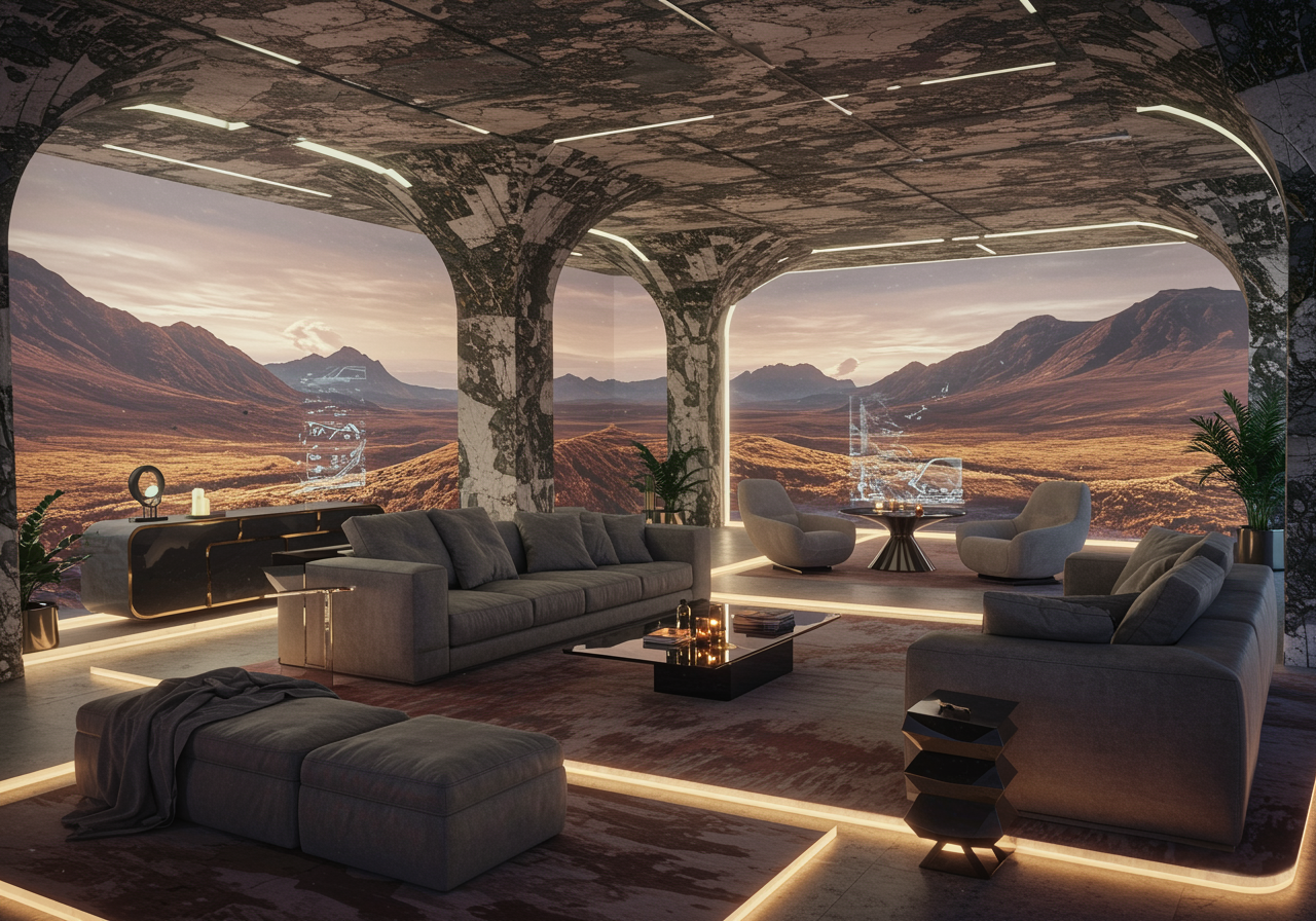Imagine an opulent, futuristic living space designed by AI, where the essence of the "grand highlander interior" comes alive. The room boasts high-vaulted ceilings adorned with intricate patterns reminiscent of a digital highland tapestry. Plush, oversized seating arrangements exude comfort and sophistication, crafted from materials that mimic both the ruggedness of the highlands and the sleekness of modern technology. Beneath your feet, a smart floor mimics the ebb and flow of natural landscapes, subtly changing texture and color throughout the day. Walls feature an ever-evolving mural of abstract highland scenery, brought to life by ambient AI-generated lighting that shifts with your mood. In one corner, a sprawling window offers an illusion of infinite highland vistas, seamlessly blending virtual reality with the tactile comforts of an exquisitely designed interior.