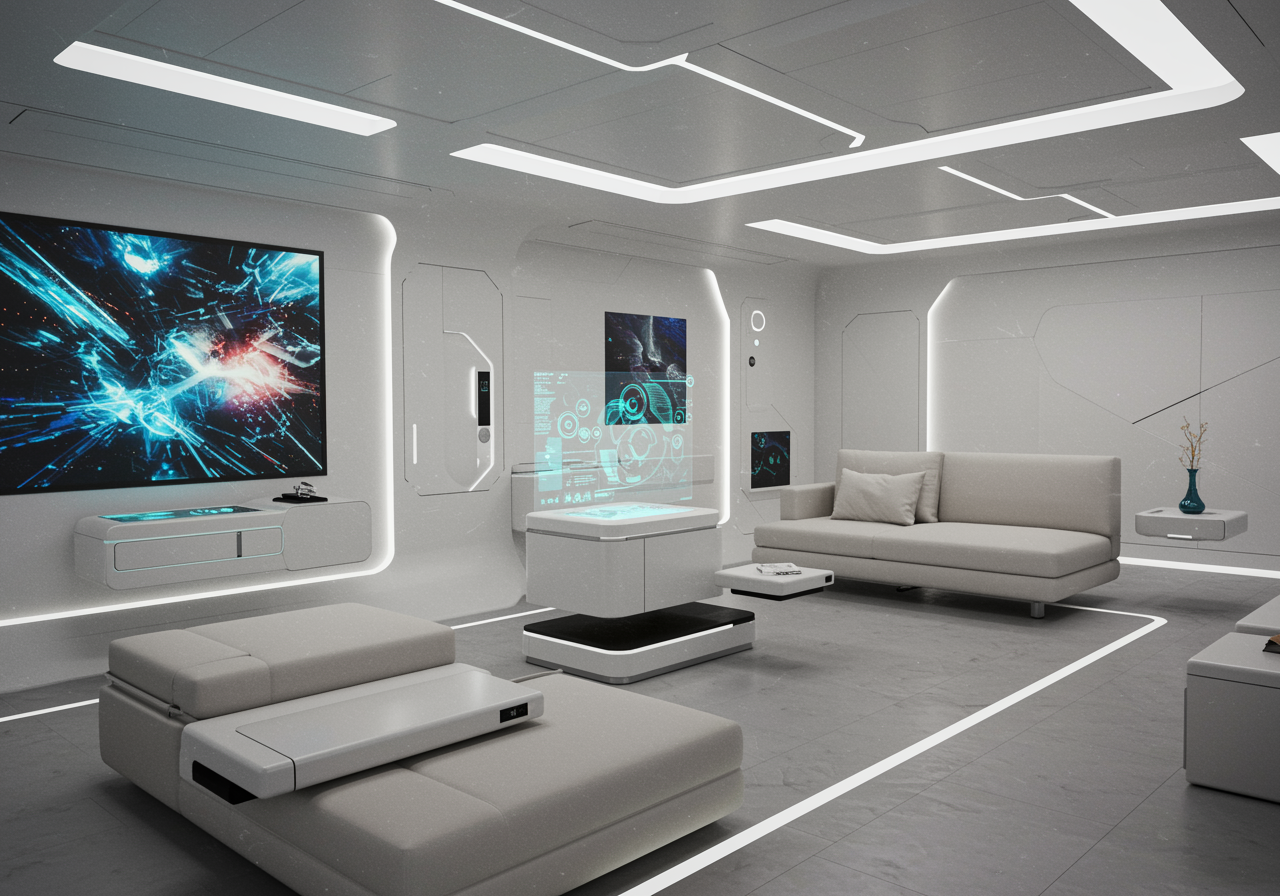 Imagine a futuristic living space designed by artificial intelligence, showcasing the essence of "gx550 interior." The room is an embodiment of sleek minimalism and advanced technology, with clean lines and seamless surfaces crafted from smart materials. The walls are integrated digital canvases, displaying dynamic, mood-adapting art. An AI-controlled lighting system casts customizable illumination that harmonizes with the room's ambient vibe. Furniture pieces, seemingly floating, are modular and intuitively move to accommodate different spatial needs. The center of the space features a holographic interface, offering an interactive hub that connects all smart devices. This avant-garde environment captures the essence of innovation, luxury, and efficiency in a single, cohesive design.