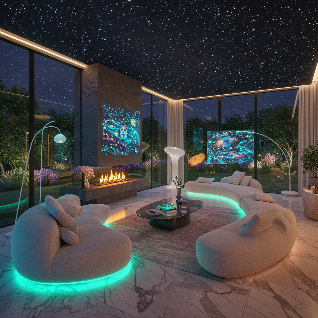 A futuristic living room blending nature with technology: imagine a spacious, airy room with walls of glass revealing a luscious garden outside. The interior features organic shapes and bio-luminescent accents, wireless floating furniture shaped like natural elements, and a ceiling mimicking the night sky with soft twinkling stars. AI-driven art rotates daily on the digital canvas above the fireplace, while intelligent lighting adjusts to the mood of the residents, casting soothing rainbows over a sleek marble floor.