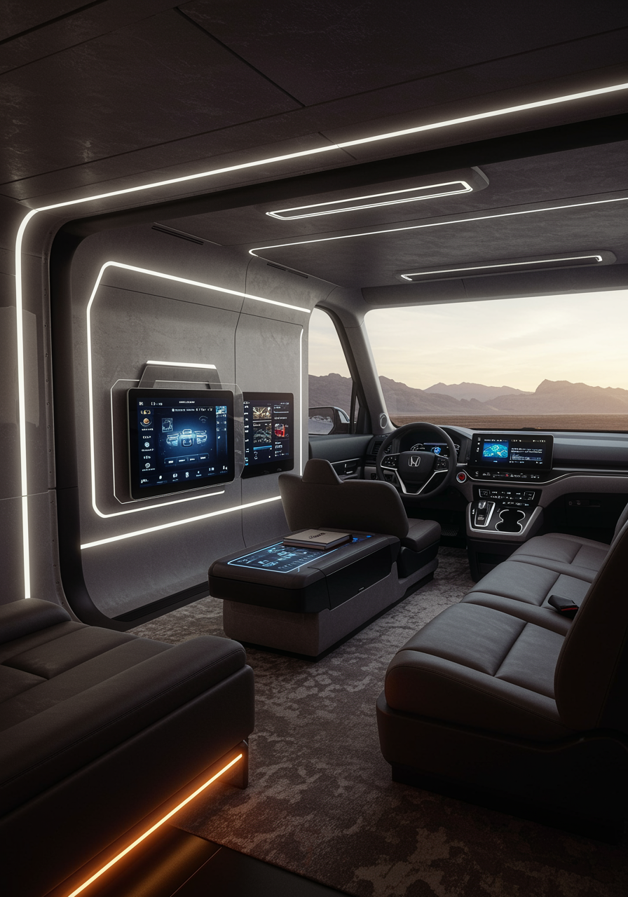 Imagine a futuristic living room where the walls and furniture seamlessly blend with the sleek design of a 2024 Honda Pilot interior. The space features plush leather seating that mirrors the car's luxurious upholstery, while ambient lighting casts a gentle glow resembling the vehicle's modern dashboard illumination. Digital interfaces are embedded into the walls, much like the car's advanced touchscreen displays, and offer smart home controls and entertainment options. Metallic accents and aerodynamic lines flow throughout the space, evoking the car's sporty yet elegant design. A panoramic view from the room showcases a dynamic landscape, as if you were driving the Honda Pilot through a scenic route. The overall atmosphere is a harmonious blend of cutting-edge technology and elegant comfort, capturing the essence of the 2024 Honda Pilot's interior design.