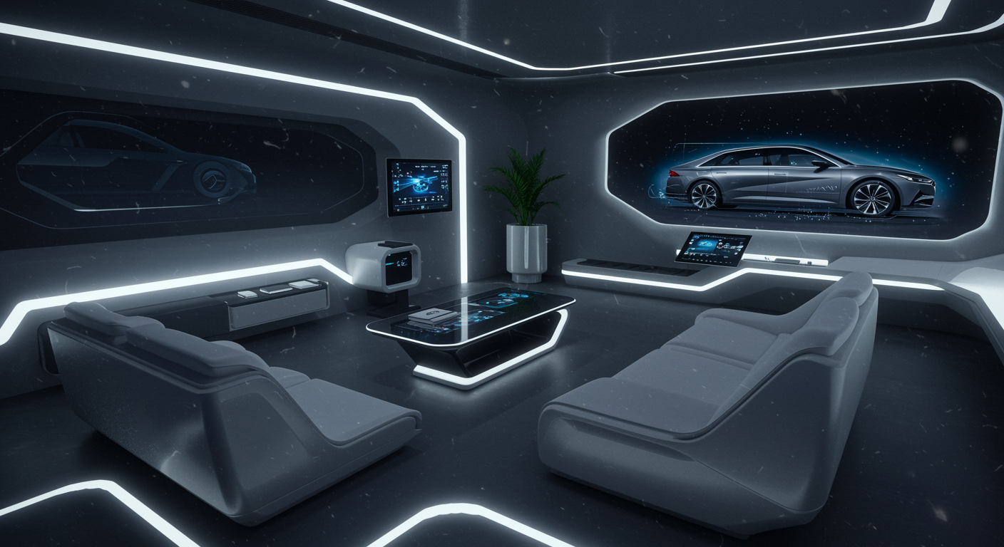 Envision an avant-garde AI-designed interior space inspired by the sleek aesthetics of the 2024 Hyundai Elantra, blending futuristic contours with smart technology features. The room is bathed in ambient light reminiscent of a car's dashboard at night, with smooth, flowing lines and contoured seating configurations that evoke the elegance of an automotive interior. High-tech materials and surfaces reflect the latest in design evolution, integrating digital displays seamlessly into the furniture and walls, alluding to the car's state-of-the-art infotainment system. The atmosphere combines the essence of automotive innovation with the comfort and style of modern living, creating a harmonious balance between luxury and technology.