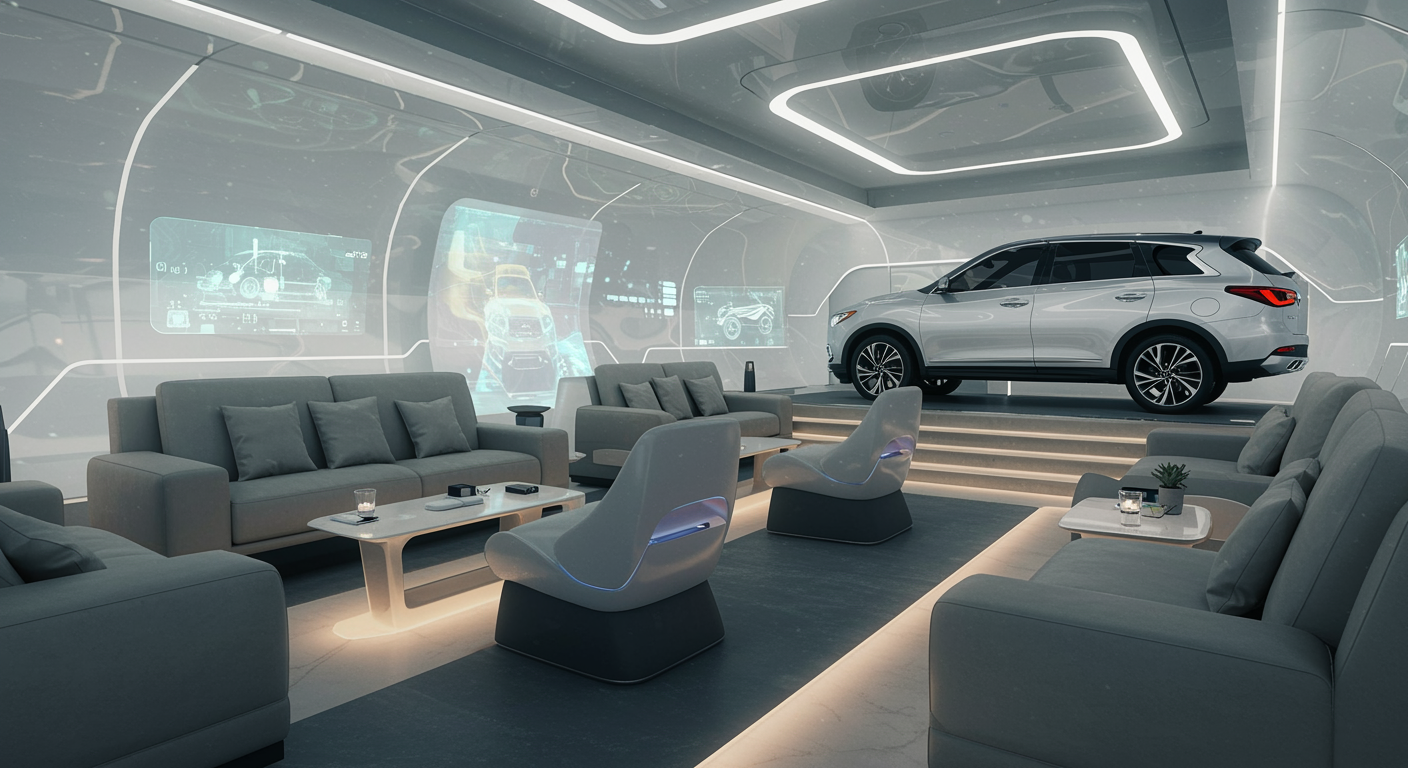 Imagine stepping into a futuristic lounge where the elegance of a luxury SUV meets the sleek innovation of AI-enhanced interior design; the space is bathed in ambient mood lighting that subtly shifts with the time of day, reflecting the external environment onto opalescent surfaces that resemble the Infiniti QX60's meticulously crafted interior panels; plush, AI-responsive seating adjusts ergonomically to the contours of guests, while holographic displays integrate seamlessly into the walls, offering interactive art inspired by cutting-edge automotive design; the rich aroma of high-quality leather blends with the subtle scent of technology, creating a haven of sophisticated tranquility and forward-thinking opulence.