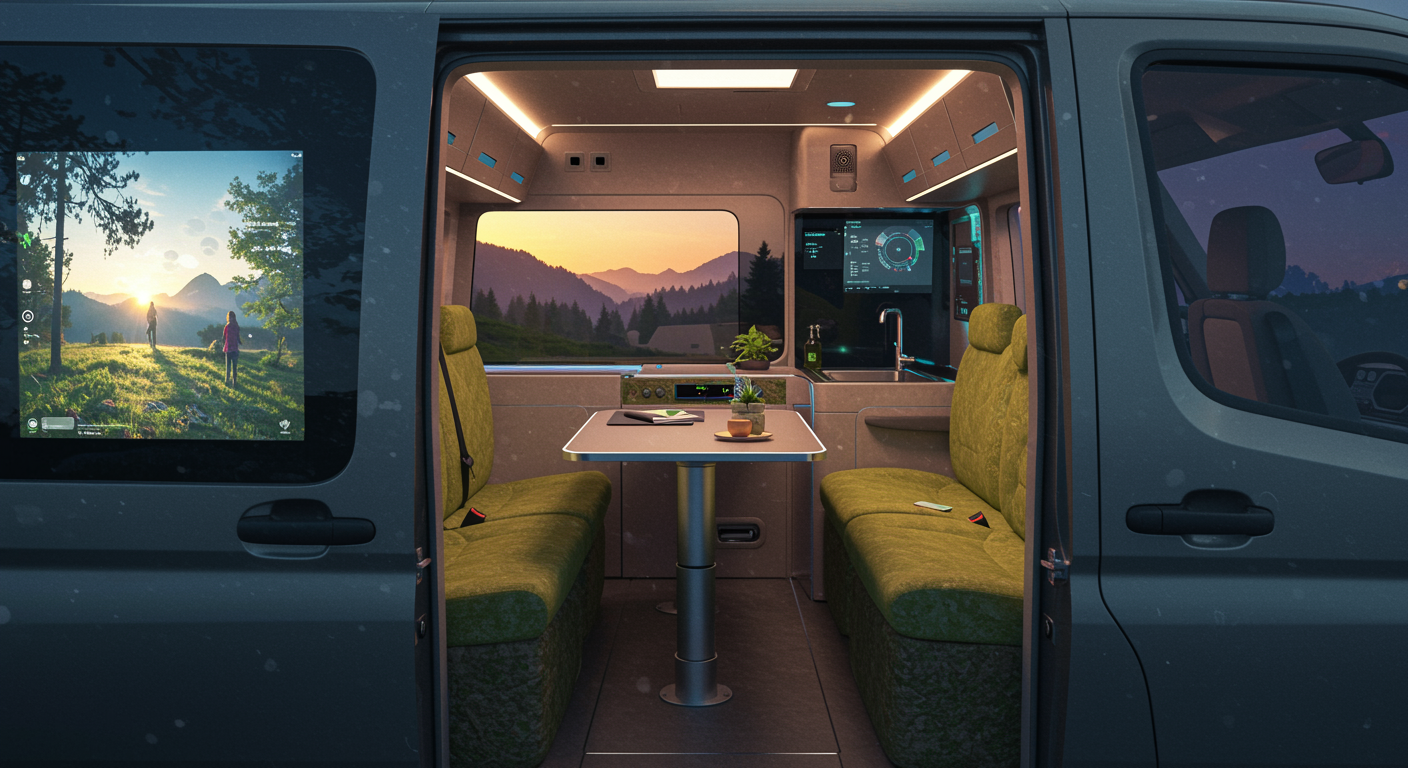 Imagine stepping into a futuristic, eco-friendly interior camper van where AI-driven design meets nature-inspired aesthetics. The space is a harmonious blend of advanced technology and organic materials, with smart glass panels that adjust tint for privacy and light control. Walls are adorned with digital displays showcasing rotating landscapes, while the seating, made from sustainable biotextiles, adapts for ergonomics and comfort. In the compact kitchen, intelligent appliances anticipate your needs, and hidden storage solutions pop open with a mere gesture. Ambient lighting, infused with the colors of a forest at sunrise, creates a calming atmosphere. This camper van is a serene yet intelligent oasis, seamlessly connecting travelers with the world outside through augmented reality windows offering real-time data on surroundings and destinations.