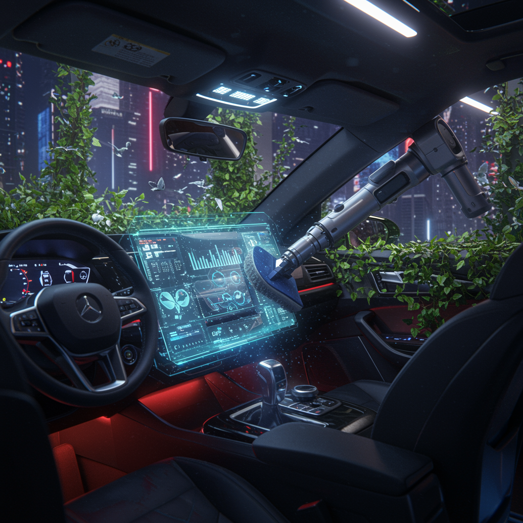 In a futuristic metropolis, an AI-powered robotic arm meticulously cleans the interior of a sleek, self-driving car parked in a high-tech auto spa. Neon lights reflect off the car's glossy surface, highlighting the advanced nano-coating on the dashboard and the holographic interface projecting cleaning stats in mid-air. The environment features a seamless blend of nature and technology, with digital vines and virtual birds creating a serene ambiance. Innovative smart materials in the car’s upholstery change colors and textures as the AI determines the optimal aesthetic, embodying the ultimate fusion of technology and luxury in car interior design.