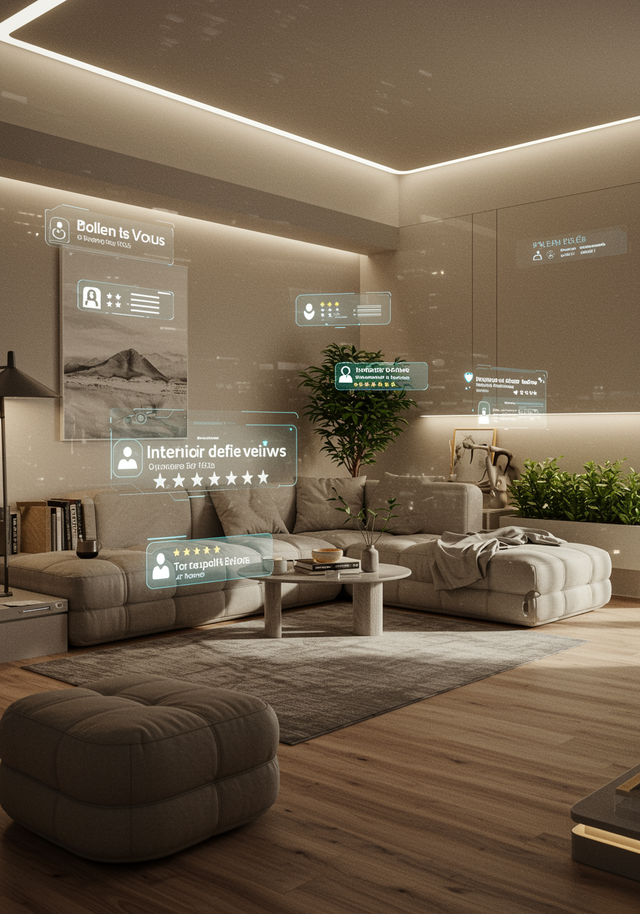 Envision a futuristic yet cozy living space meticulously designed by AI, where every detail is an ode to both innovation and comfort; the sleek, modular furniture softly gleams under ambient lighting that adjusts to your mood, while verdant indoor plants punctuate the minimalistic décor with bursts of nature; a seamless blend of organic textures and futuristic materials elegantly interact to create a harmonious environment that invites relaxation and inspiration, inviting a tableau where functionality marries aesthetics; around the room, holographic reviews and ratings float subtly in the air, providing an ethereal chorus of the silent yet essential feedback from the diverse experiences of virtual guests, all underlined with the keyword "interior define reviews."