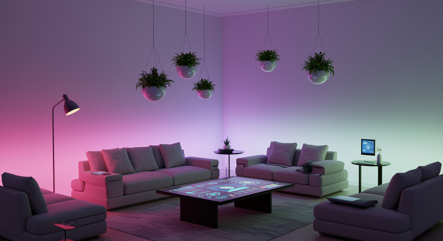 Imagine a living room where the walls subtly shift colors throughout the day, guided by artificial intelligence to enhance the mood and lighting naturally. The furniture within the space appears minimalist but is embedded with smart technology, adapting shape and cushioning based on user preference. Central to the room is a coffee table with an interactive digital surface that creatively displays the user's personal data dashboard and art synchronized with their lifestyle. Suspended from the ceiling are hanging AI-driven planters nurturing a small indoor ecosystem, adjusting their position and hydration based on sunlight metrics and air quality inputs. This fusion of technology and design redefines the concept of 'interior definition,' blurring the line between physical and digital environments in a harmonious coexistence that feels both futuristic and organically warm.