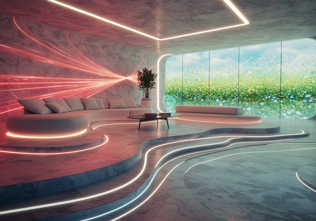Imagine a futuristic living room where sleek AI-generated furniture adapts in real-time to the needs of its inhabitants. The walls display dynamic, colorful light patterns that shift with the time of day, while a central holographic assistant harmonizes the room’s ambiance with innovative soundscapes. The flooring flows like liquid marble, subtly reconfiguring its terraces to create cozy reading nooks or expansive spaces for social gatherings. The space blends cutting-edge technology with nature, as digital windows project breathtaking views of lush, AI-designed gardens swaying in the cyber breeze. This image captures the essence of "interior design ai," portraying a harmonious, intelligent environment that evolves with the rhythm of life.