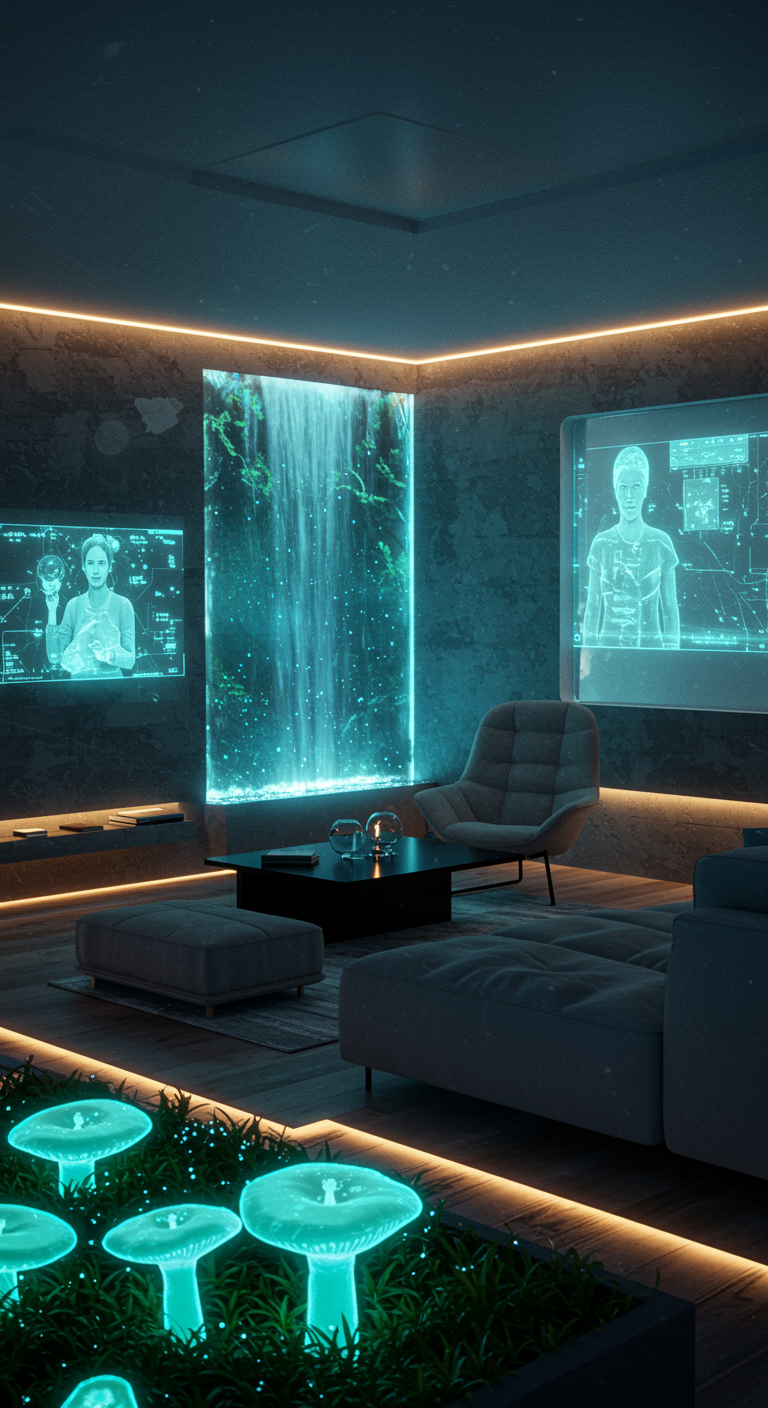 A futuristic living room designed by an AI, seamlessly blending nature and technology with bioluminescent plants, interactive holographic walls displaying personalized art, and sleek furniture that adjusts form and function via interior design apps; a serene waterfall wall acts as a centerpiece, with soundscapes and lighting tailored to the occupant’s mood, creating an ever-evolving, harmonious space.