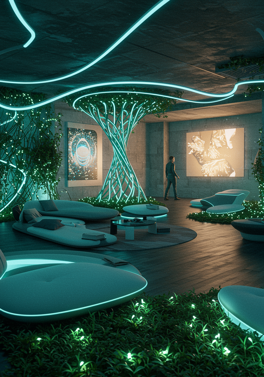 In a futuristic loft, seamlessly blending nature and technology, an AI-driven interior design showcases flowing organic forms intertwined with smart materials. Bioluminescent plants softly illuminate the space, while dynamic, shape-shifting furniture adapts to the user's mood and purpose. Walls display digital art that evolves throughout the day, guided by environmental changes and user interactions. The scene captures a harmonious balance between cutting-edge innovation and tranquil living, exemplifying the essence of "interior design designmode24" through an immersive sensory experience.