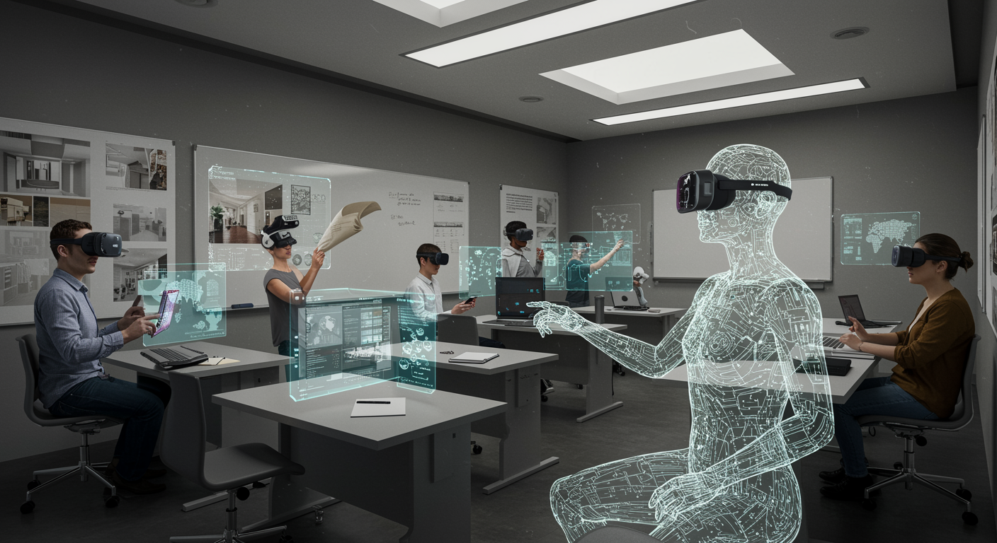 Envision a futuristic classroom set within a sleek, ultra-modern virtual reality space where students from around the world engage in an interactive AI-driven lecture on interior design. The room is filled with floating holographic furniture blueprints, digital mood boards that adapt in real time based on AI analysis, and intelligent walls that transform textures and colors with a simple gesture. A diverse group of students, wearing augmented reality glasses, collaborate remotely, adjusting 3D models with intuitive hand movements while their AI mentor—a humanoid avatar composed of flowing digital patterns—guides them through complex design concepts. Above, a virtual skylight casts adaptive lighting, simulating the perfect ambiance for any design scenario. This scene embodies the convergence of advanced technology and creative education, capturing the essence of pursuing an interior design degree in an immersive online environment.