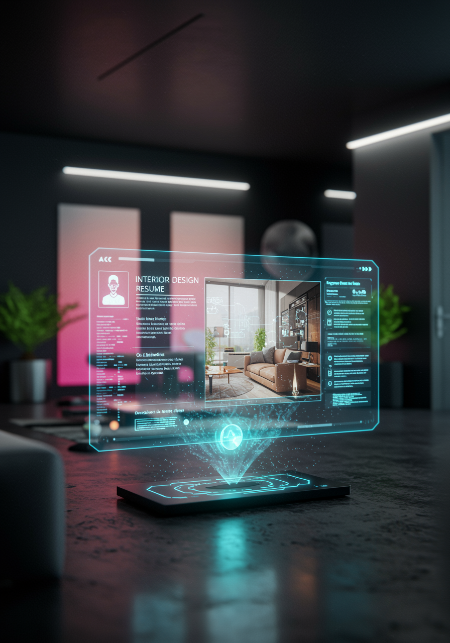 In a sleek, futuristic living room that seamlessly blends modern minimalism with high-tech elegance, the central focus is a holographic display showcasing an "interior design resume." The display floats in mid-air, surrounded by an ethereal glow, highlighting various design elements such as rich textures, adaptive furniture, and ambient lighting. In the background, smart walls dynamically shift colors and patterns in response to soft ambient music, while a subtle integration of greenery infuses the space with a sense of serenity. The overall atmosphere conveys a harmonious blend of creativity and cutting-edge technology, emphasizing how AI can revolutionize the storytelling of an interior designer's portfolio.