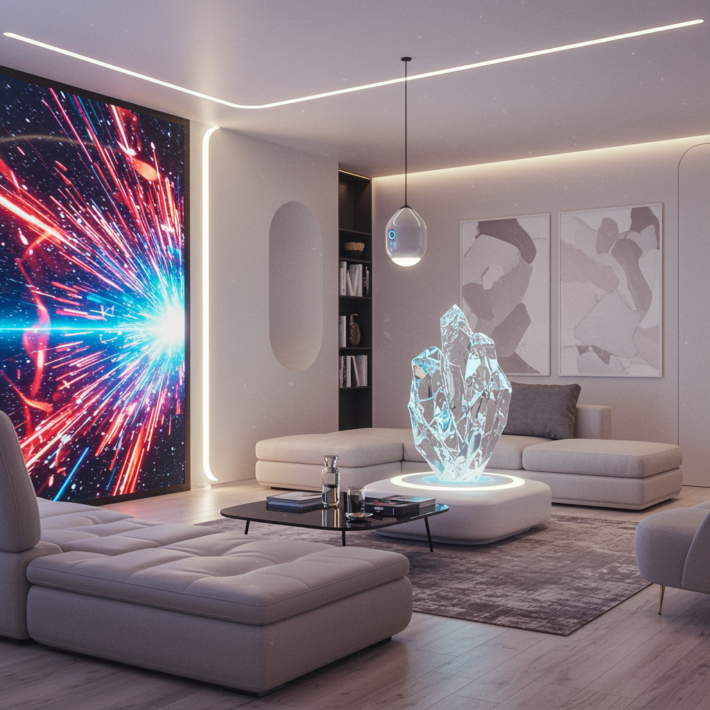 Imagine a futuristic living room where AI seamlessly integrates with every element of the decor; walls are interactive screens displaying dynamic art that adapts to the residents' moods, furniture is designed with sleek, ergonomic shapes that adjust for optimal comfort, and a central AI hub in the form of a crystalline sculpture provides ambiance lighting, temperature control, and a constantly evolving digital concierge service on demand. The room's aesthetic blends minimalist tranquility with cutting-edge technology, all inspired by the most innovative concepts on leading interior design websites.